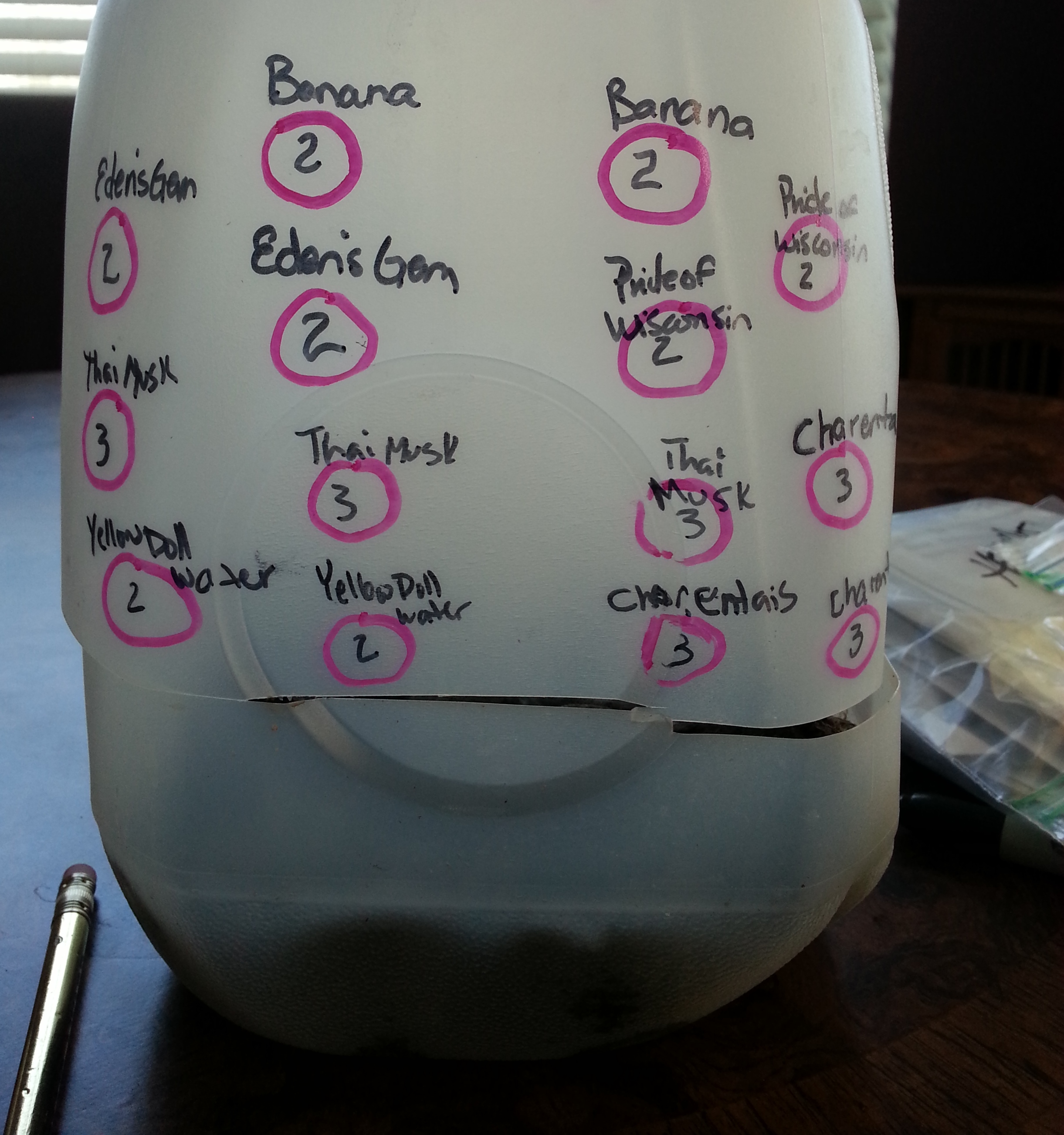 This picture is from the first year I tried this. You can see from the markings on the outside that I used soil and tried to keep track of the seedlings by an estimate based on the rows I started them in. It was a mess. I couldn’t easily separate the seedlings and I lost track of which rows were which. Plus if the jugs were bumped or knocked over the whole thing mixed together and the map on the outside was useless. The peat pots proved to be a much better choice.