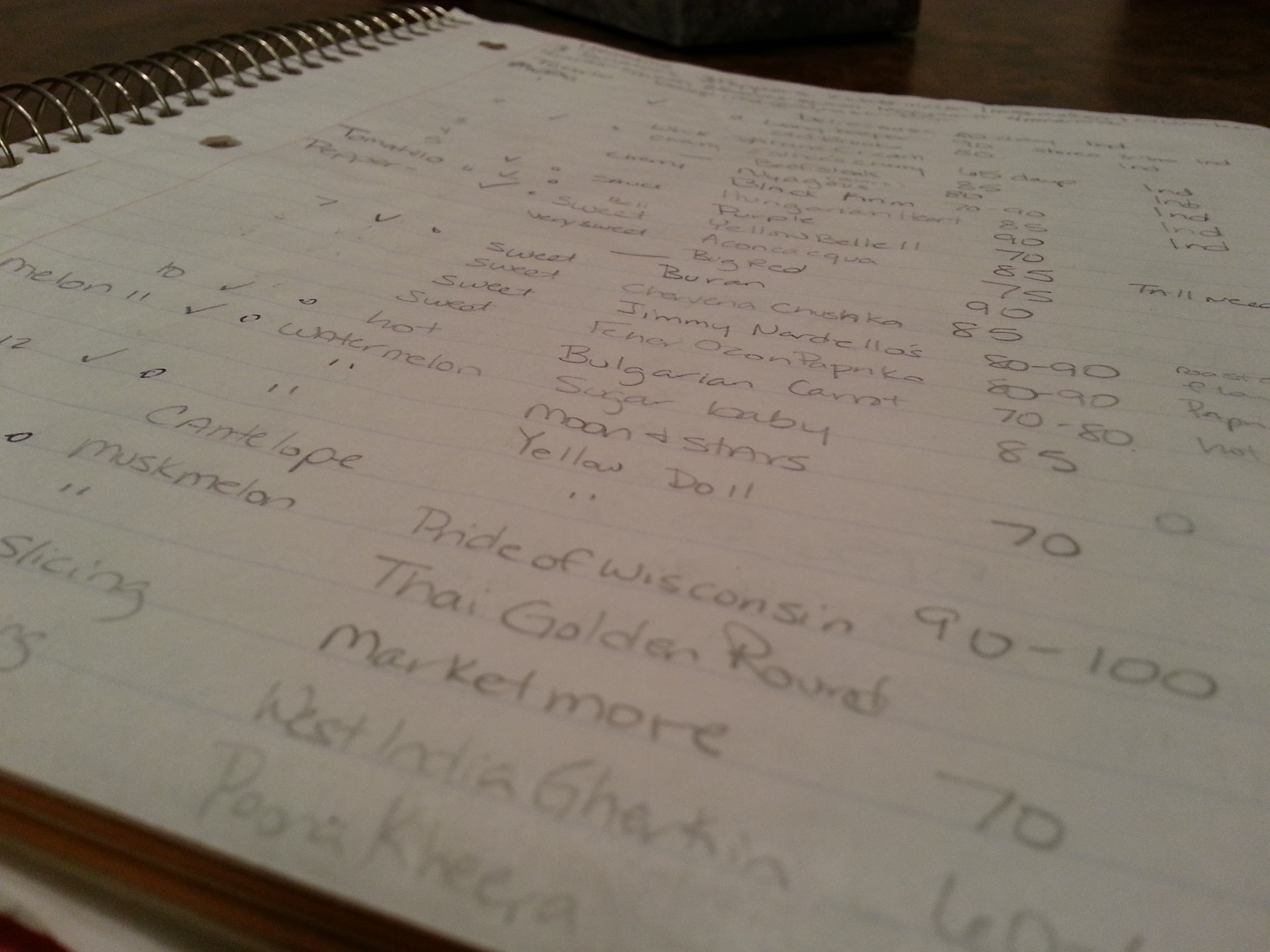 I write anything I would want to know when I transplant the seedlings. Such as: type, height, width, days to germinate, days to maturity and flower/fruit color. This is way more information than would ever fit on a tag and it’s simple. I like drawing maps for things rather than tags even after transplanting. I haven’t found a cheap way to make lasting tags that can withstand sun bleaching, water and/or critters and kids knocking them down and moving them. My spiral notebook and 5 subject binder are always accurate and ready!