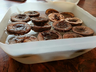 I love peat pots. They are sterile, you can plant them directly out in your garden and most importantly you can separate them easily, so you can start different varieties and easily keep track of what is what. Water the peat pots until they expand.