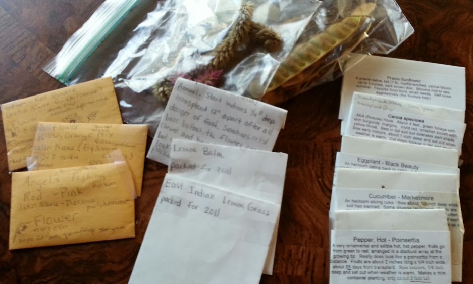Seeds from my neighborhood plants (above) and from a wonderful seed train I was a part of for several years (below).