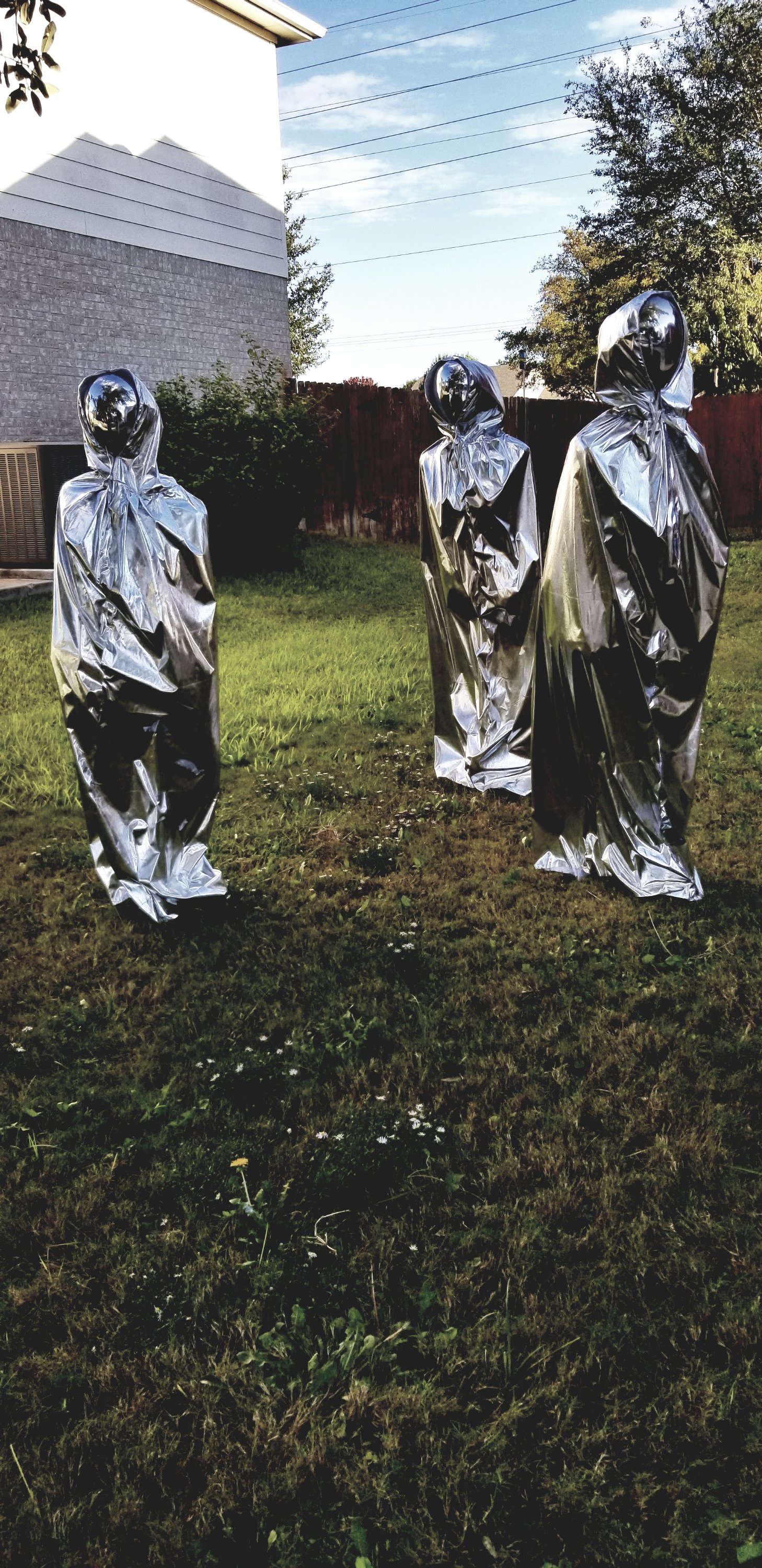 You need something inside the ghost to keep it upright. I suggest buying a piece of rebar, drive it into the ground and slide a taller piece of pvc pipe on it (I think plain rebar would poke through the tape.) Put your ghost over it (making sure the pvc has been cut to rest in the top of the ghost’s head.) To secure it: I suggest getting some landscape pins from a home and garden store. Keep your packing tape handy. I will tape over the landscape pins this year (once they’re through the ghost and in the ground.) The pins tore through her dress because it was pretty windy last year. Extra tape should prevent that. Plus: You don’t want this to fall over or blow away. We had no time to work on her support this year so my husband just took the ghost and put her on a large floor lamp with the shade removed. It wasn’t quite tall enough so the skirt buckled (not permanently, but it would look much more impressive set up at the right height.) but more importantly: ours blew over! We got home to find the tape had touched the light we had aimed at her…and it was smoking. We were very lucky the ghost didn’t catch fire in the front yard!