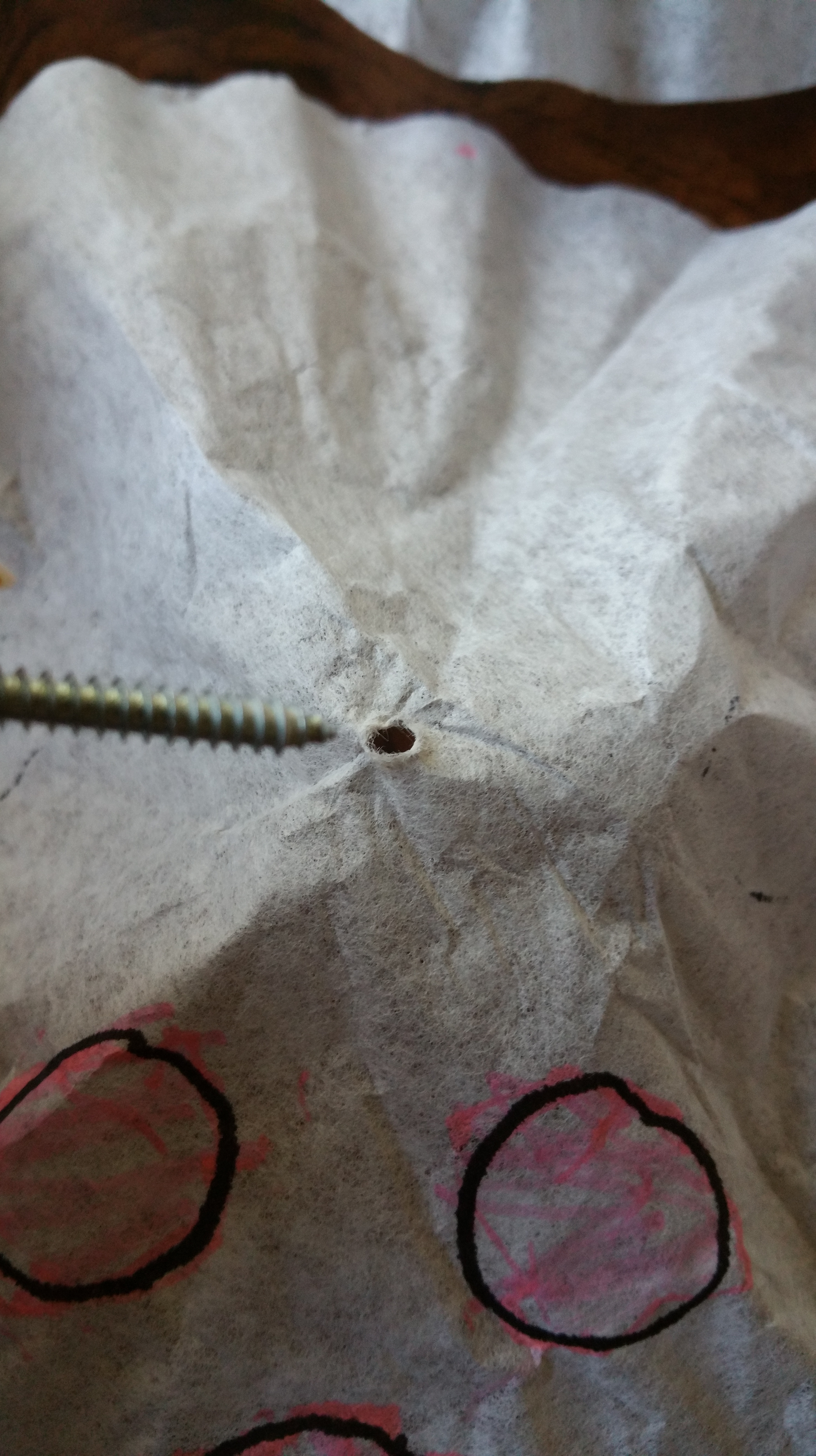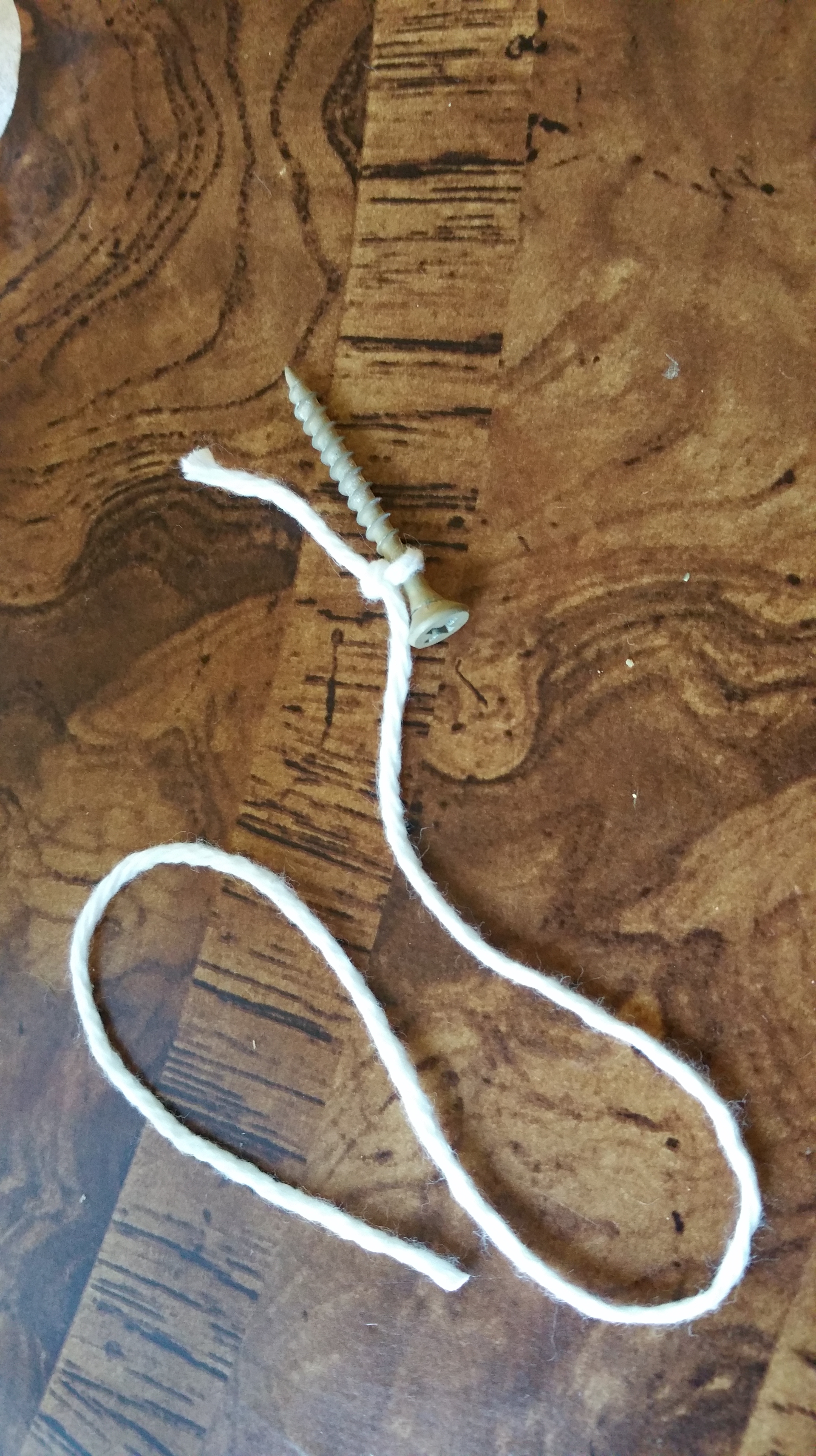 Tie the string or yarn to a screw, nut or bolt underneath the ghost/monster. (This is a great use for all of the accumulated odds and ends in your junk drawers!) This will weight the filter and prevent the yarn or string from pulling out of the hole in the filter.
