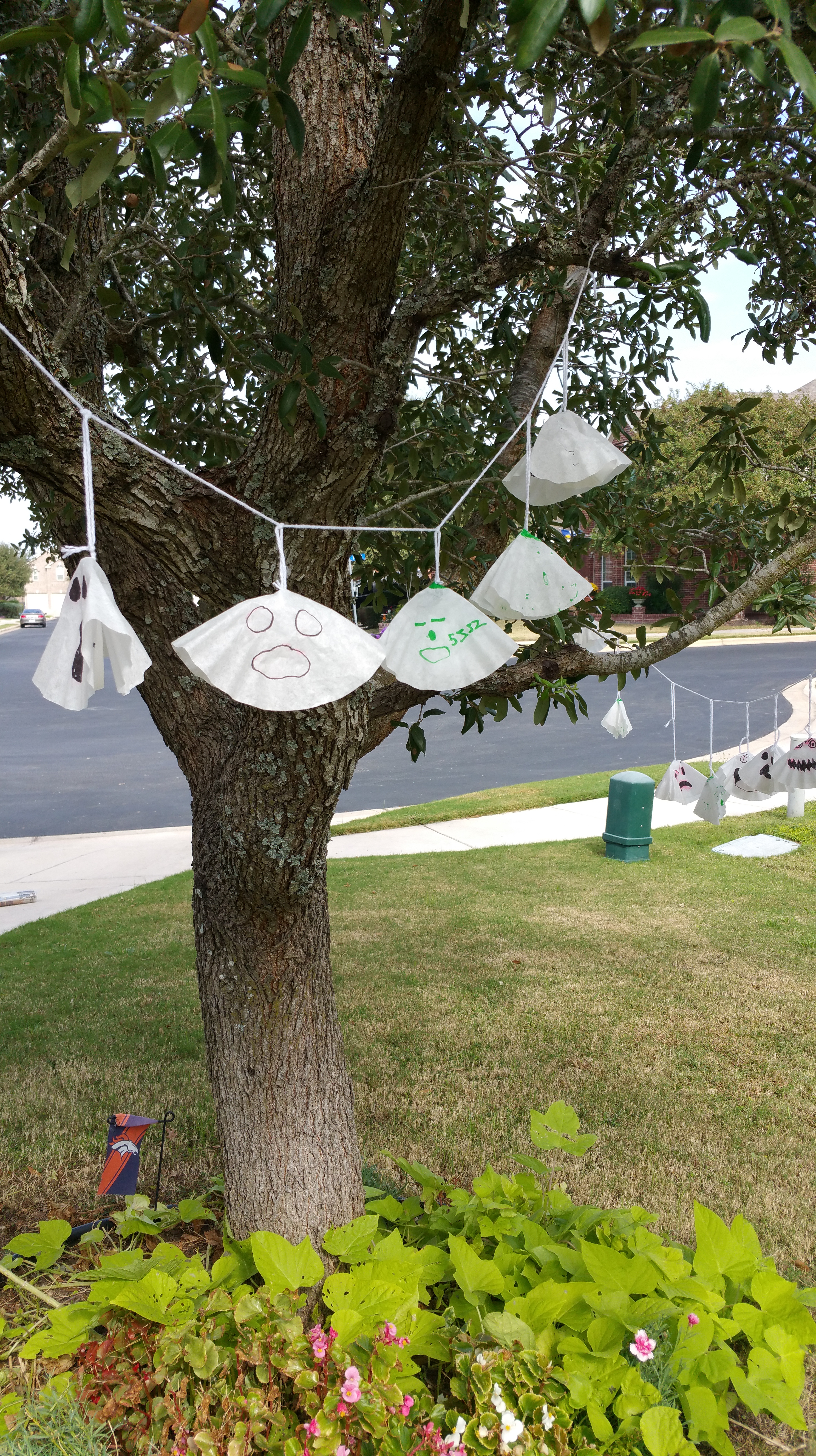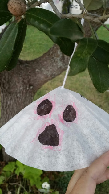 I also have young children. I wanted to do something that they could help with, so it had to be simple. I decided on a garland of ghosts. We bought a package of coffee filters and folded them into triangles. I drew faces on some of them with magic markers and my four year old colored on those. My seven year old drew his own ghost faces on his. After my kids were finished I used some cellophane tape and taped the ghosts into a cone shape.
