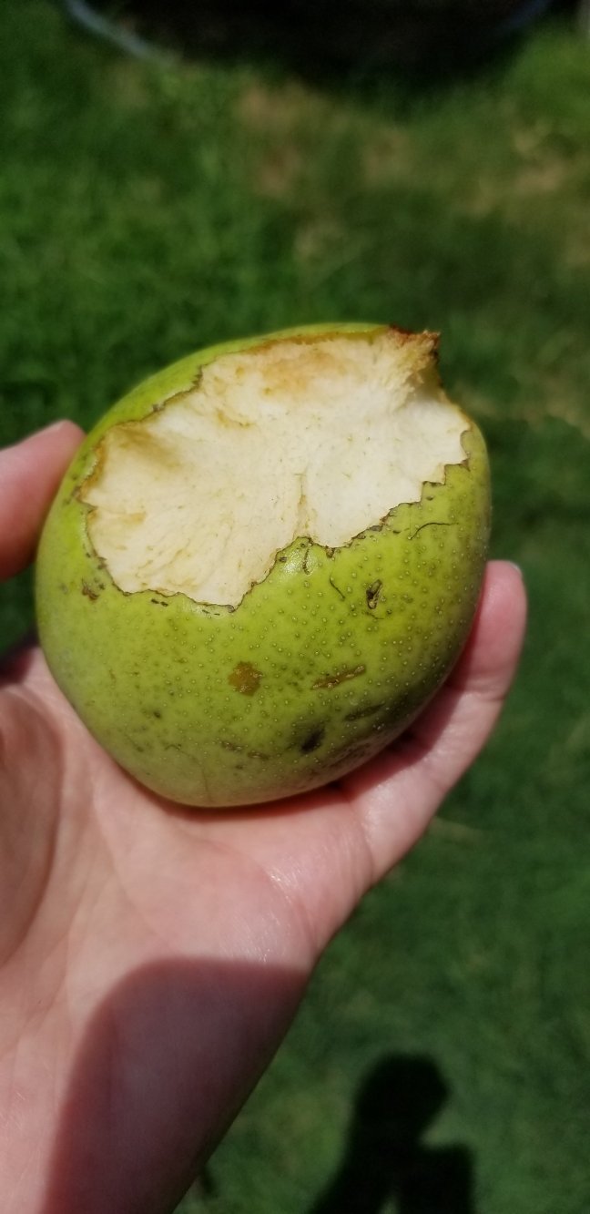 Picking pears requires knowing when to do it, as all European pears (and Oriental/European hybrids) need to be removed from the tree prior to ripening and be fully ripened indoors. If your Biscamp pears are about the size and weight of a Bartlett, that you would buy at the grocers, you are in the right time frame. Also, when your backyard wildlife begins getting a taste for the fruit, you know you are close to harvest. One of the best ways to gauge ripeness is observing how the fruit hang. If the stem is arched and the fruit hangs out and to the side: the pear isn’t ripe. If the pear has stretched the stem straight down, from its own weight, it’s close to ready to pick.