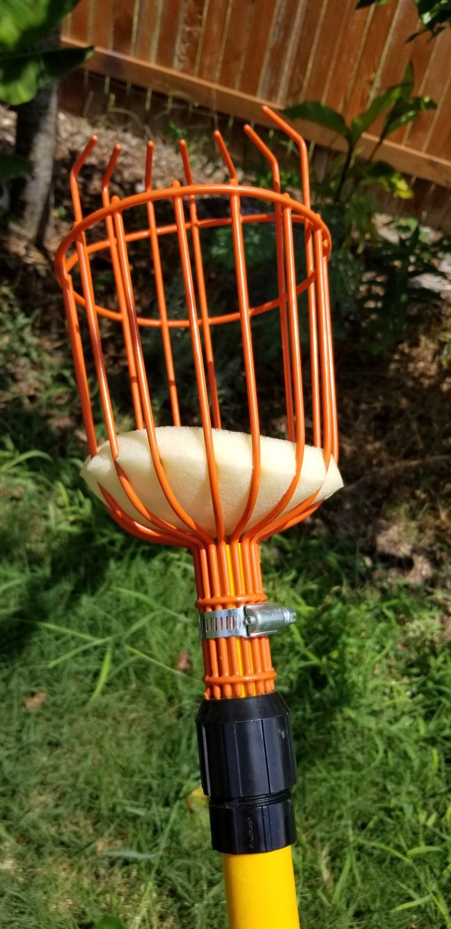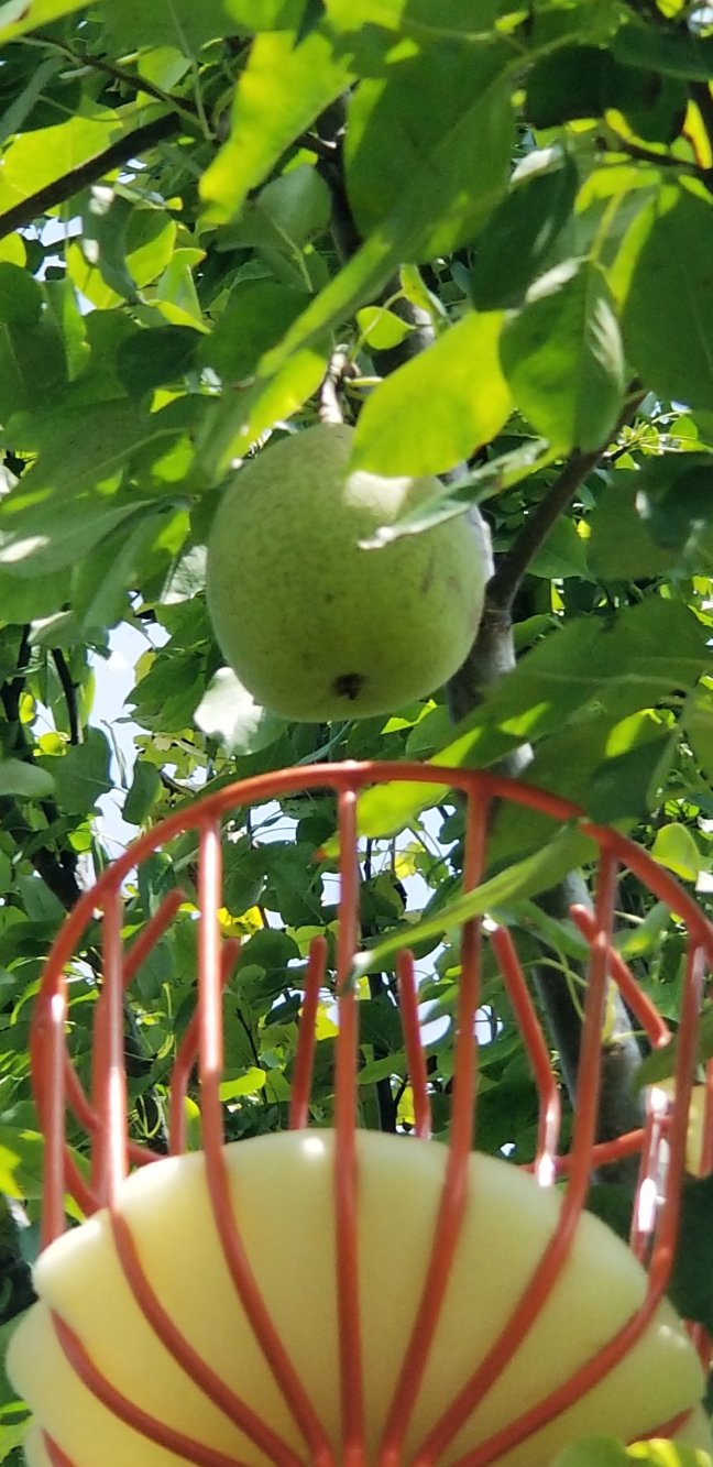 I don’t mind only saving half of the tree’s flowers if I get a freeze, by draping the tree with a long piece of burlap, as I use my pear for both privacy and fruit. This year, I didn’t get a late freeze. So I got a lot of pears throughout the tree. I have let the pear grow to its full height. I have an extension fruit harvesting basket, and what I can’t reach from the ground I send my husband out on a ladder (with the harvest basket) to get the pears at the very top.