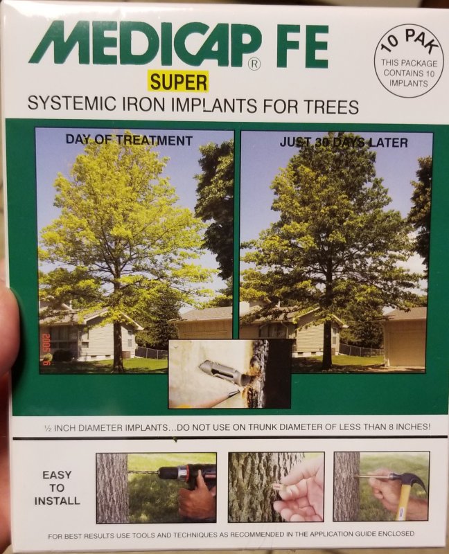 Having an arborist come out and do a trunk injection of iron is not in my budget. So, after searching online, I found these implants: I will update this post next year and tell you what I think of them.
