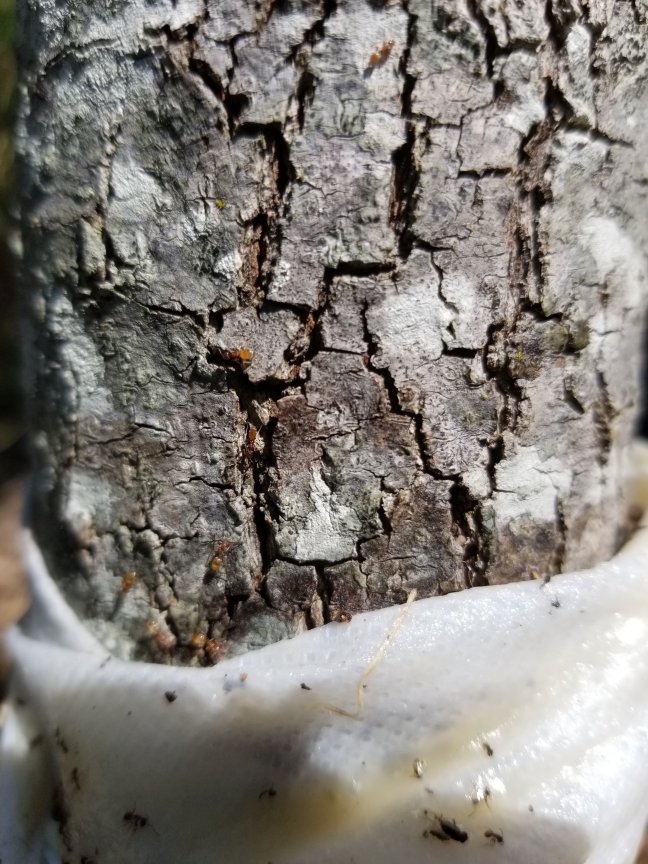 In an hour or so go back out and check the ant activity. If it hasn’t slowed down, you’ll know that they’ve found a way around it, probably in a crack in the bark, on the inside of the wrap. At this point it is messy to repair. I recommend running another layer of wrap and keeping it tight over the area they are using or stick a small piece of something fluffy like batting into the crack they’re using. This product only works if they can’t get around it, and they’ll spend hours trying to find a way.