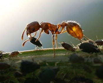 Ants farm aphids by placing them where the aphids can suck the most liquid from the tree leaves. They will place aphids all over the tree’s new growth and it will become a full on invasion quickly. Once the aphid’s piercing mouth parts go to work, they get a powerful push of sugary water from the phloem and the ants begin milking them. In return for the liquid that the ants receive (called honeydew) the ants defend the aphids. Both insects benefit from this arrangement, my trees do not.