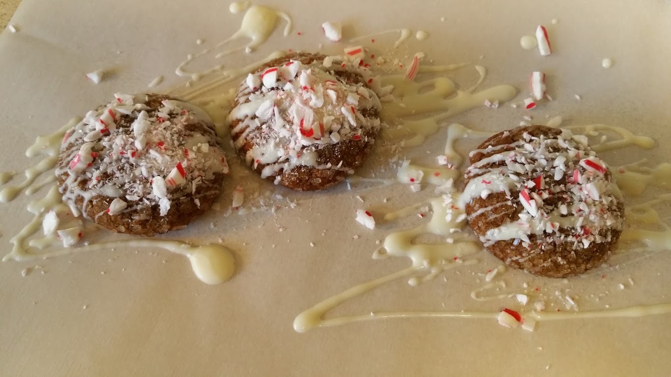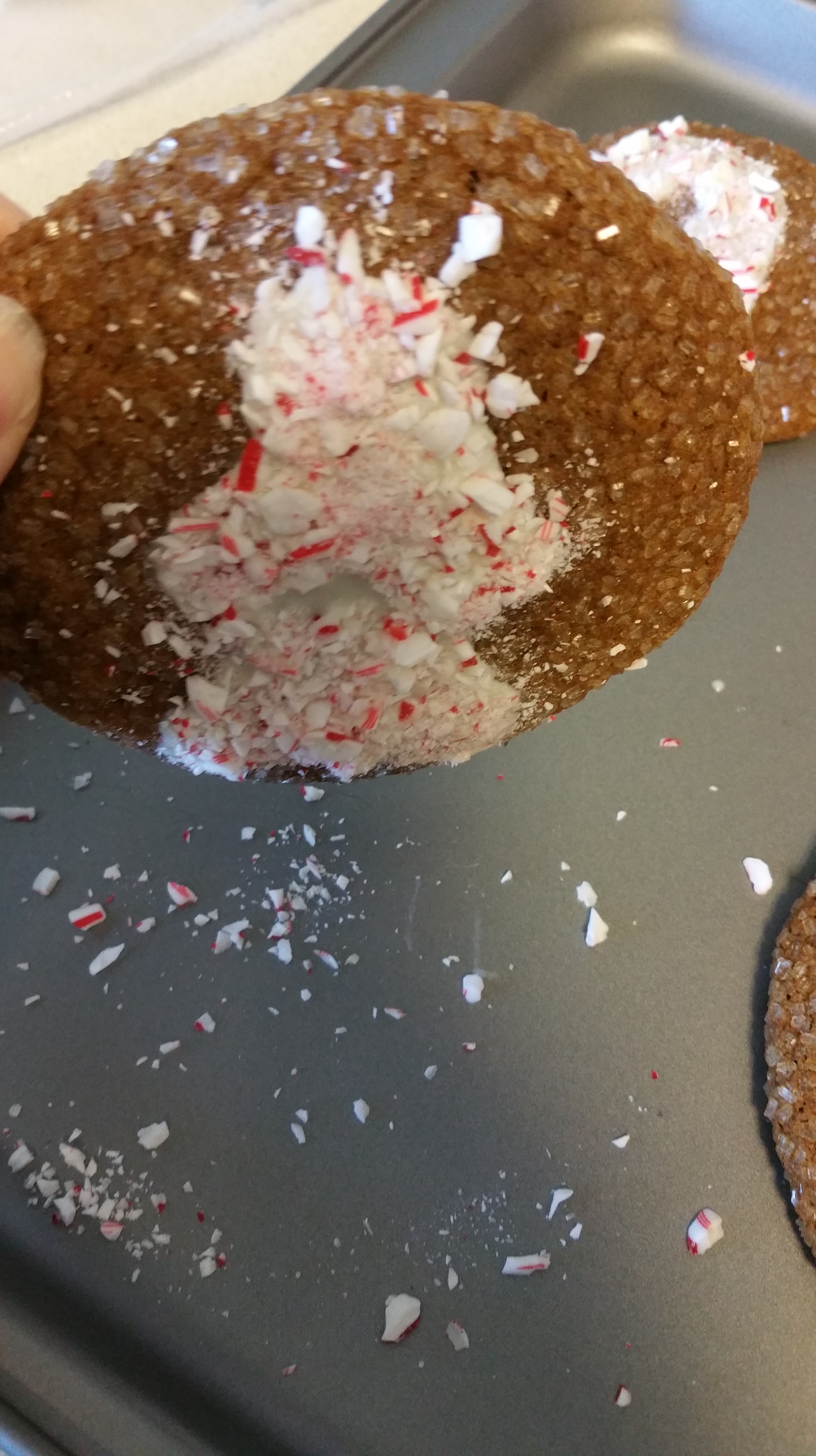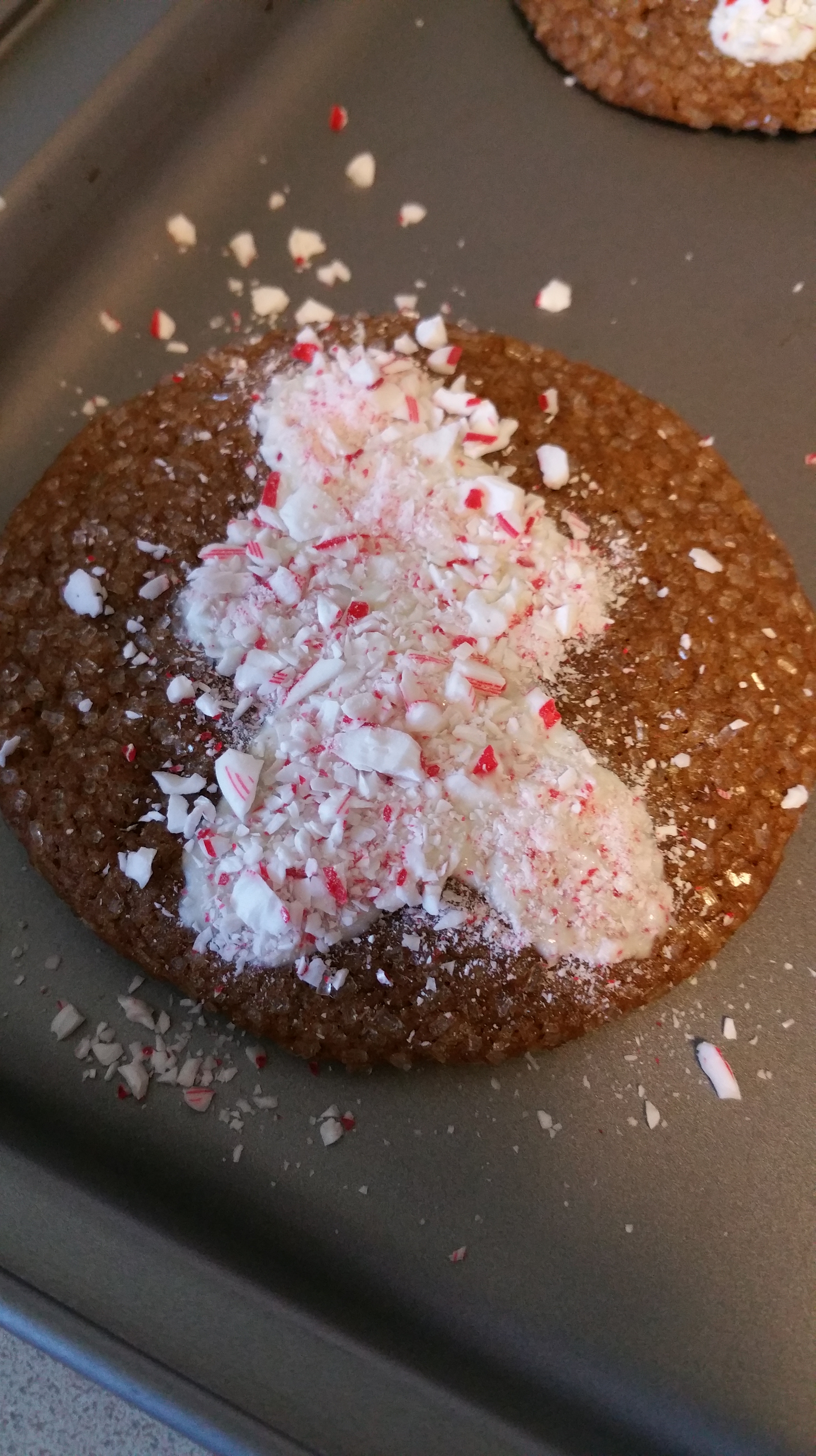 As you are putting the chocolate on: you need to have your crushed candy canes ready. I had a box of mini candy canes and I crushed them, with the wooden handle of a knife, right in the little bags they came in. This made for easy application, too. I just cut the end off with scissors and sprinkled the candy cane pieces directly on the cookie. Do one cookie at a time or your chocolate will harden and the candy won’t stick. You don’t have to push the candy down. It will stick on its own. The crushed candy canes will have pretty chunks, and also: not so pretty, powder at the bottom. If you really want to go all out, you could put the candy in a sieve and separate the powder from the chunks. But be careful. The high humidity we have down here made the candy pieces stick to everything (including themselves) and weren’t usable after about fifteen minutes because they had fused back together or stuck to the cookie sheet. I would crush and apply as you go.