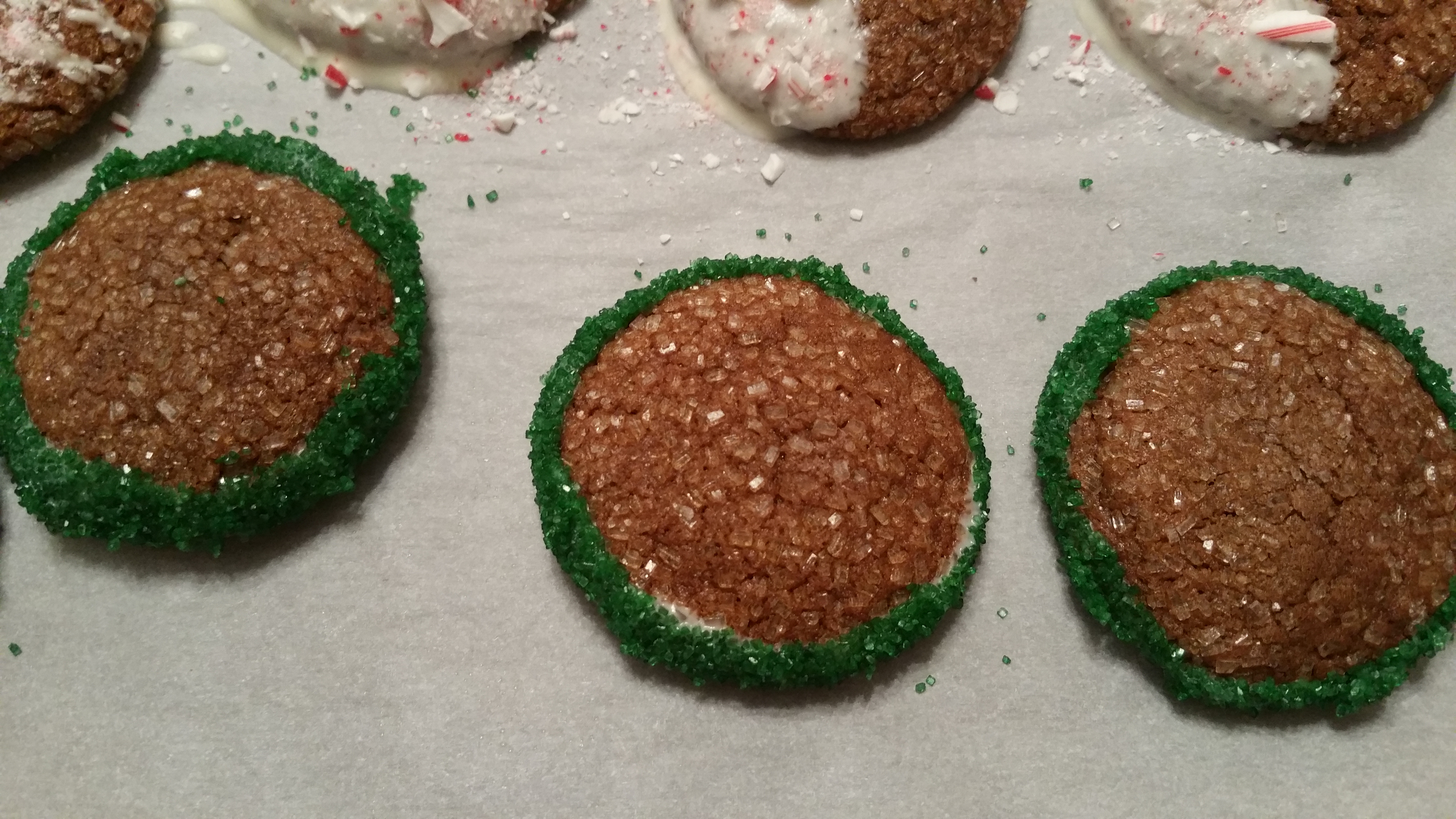 I also rolled the edge of some of the cookies in chocolate and then rolled the chocolate outlined cookies in green sprinkles. For this, I used the spoon I used earlier. I dipped it in chocolate and ran the cookie’s edge through the pool of chocolate on the spoon. Then I put green sugar crystals on a small plate and ran the edge of the chocolate covered cookie through the green sprinkles. It was a lot like the glue and glitter projects I did in elementary school (except this time I didn’t need to be warned not to eat the project!)