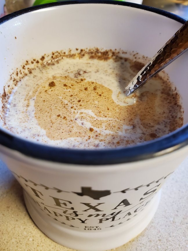 Find a mug you’d like to drink this out of and fill it with hot milk or a milk substitute. If your milk gets hot enough that it forms a skin, skim that off or it will bind your spices together and they will sink to the bottom of your cup unmixed. (This is why most traditional recipes combine butter or ghee with the spices and heat them first. Going that direction will give you a more consistent mixture but it is extra time and extra calories that I choose not to use with this, especially since what I’ve usually got on hand is whole milk.)