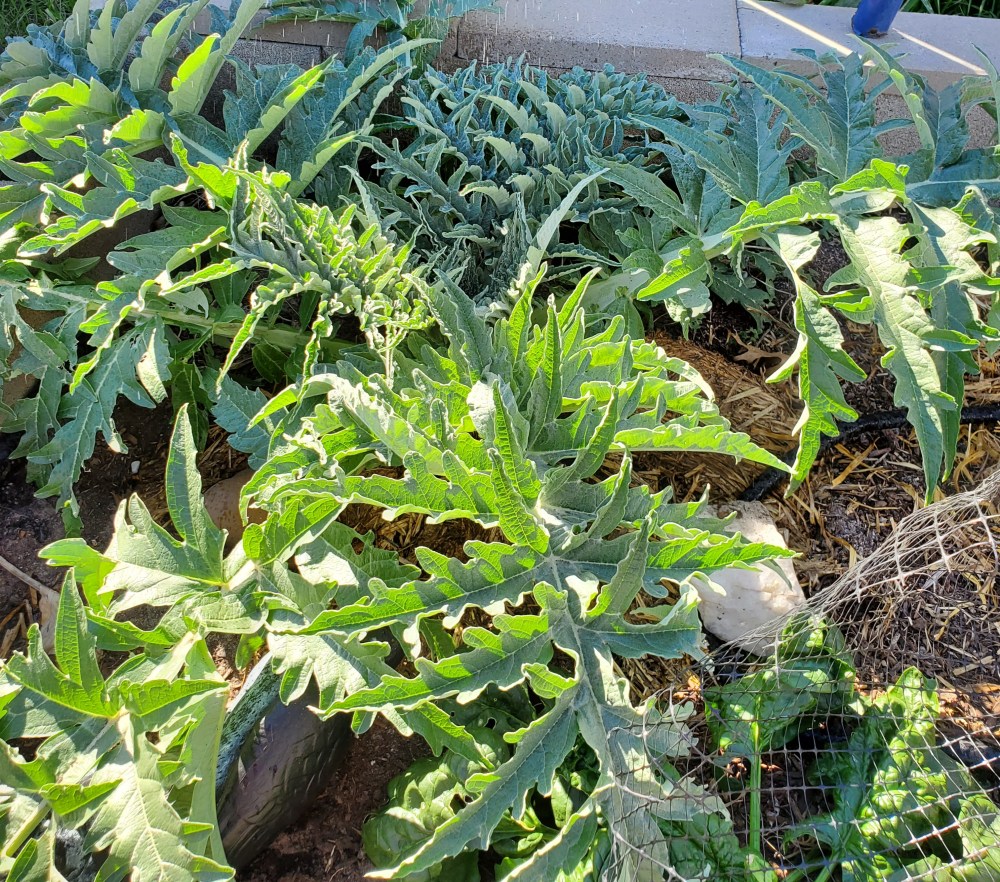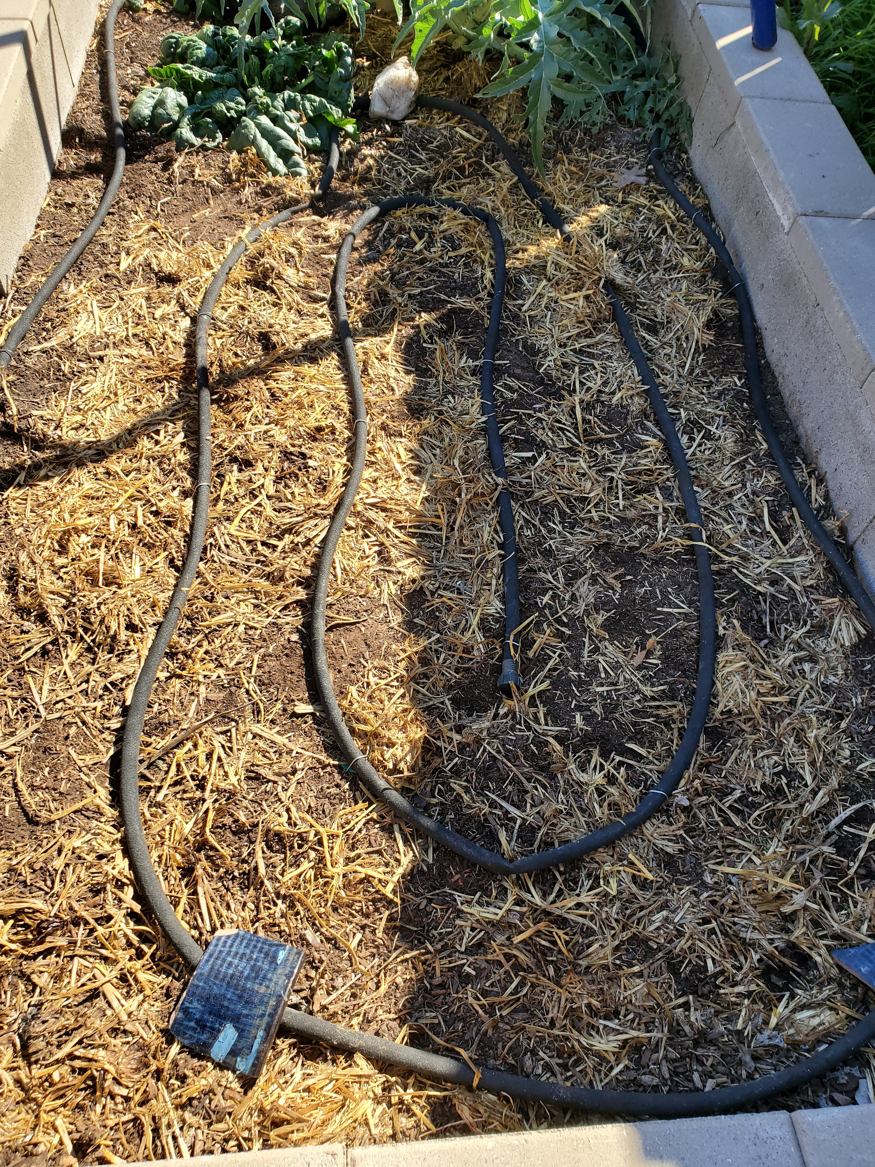 I have a few things that are already growing in my beds that I planted in the fall. Some spinach and an artichoke. So I ran my hoses around those. Some tips to keep in mind when you are running soaker hoses are: