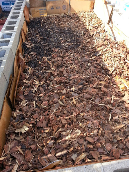 We used about 5 bags of mulch in this bed. I just bought the cheapest mulch I could find which ended up being pine bark mulch. The larger the chips: the longer the chips will last. Remember to wet as you go!
