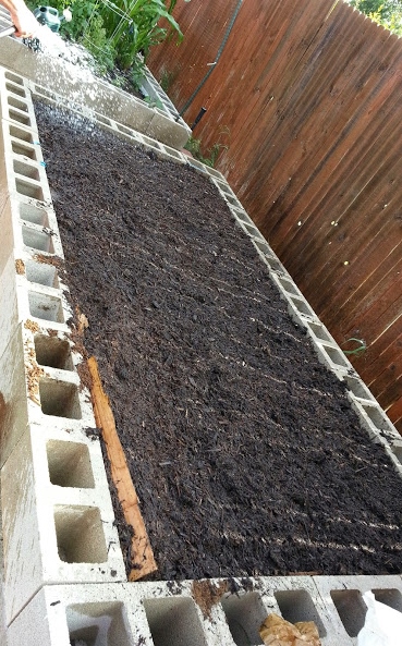This is a cinder block bed. The inner dimensions are 6 by 10 feet. We lined it with cardboard. It’s two blocks deep. Filling this with soil to the very top of the cinder blocks will settle to about 1.5 cinder blocks high in the first season.