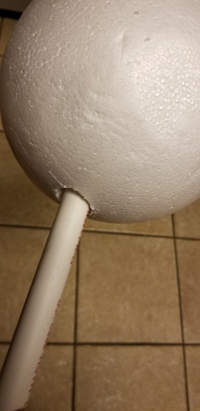 Drip hot glue into the hole and place the ball onto the pipe. Then, drip hot glue over the top of the head and carefully place the mask on the ball. Try and get this straight and where you like it before the glue hardens. If you skip this step, since this mask is much heavier in the area with the latex face, it would just slide down and look like it was looking at the ground.