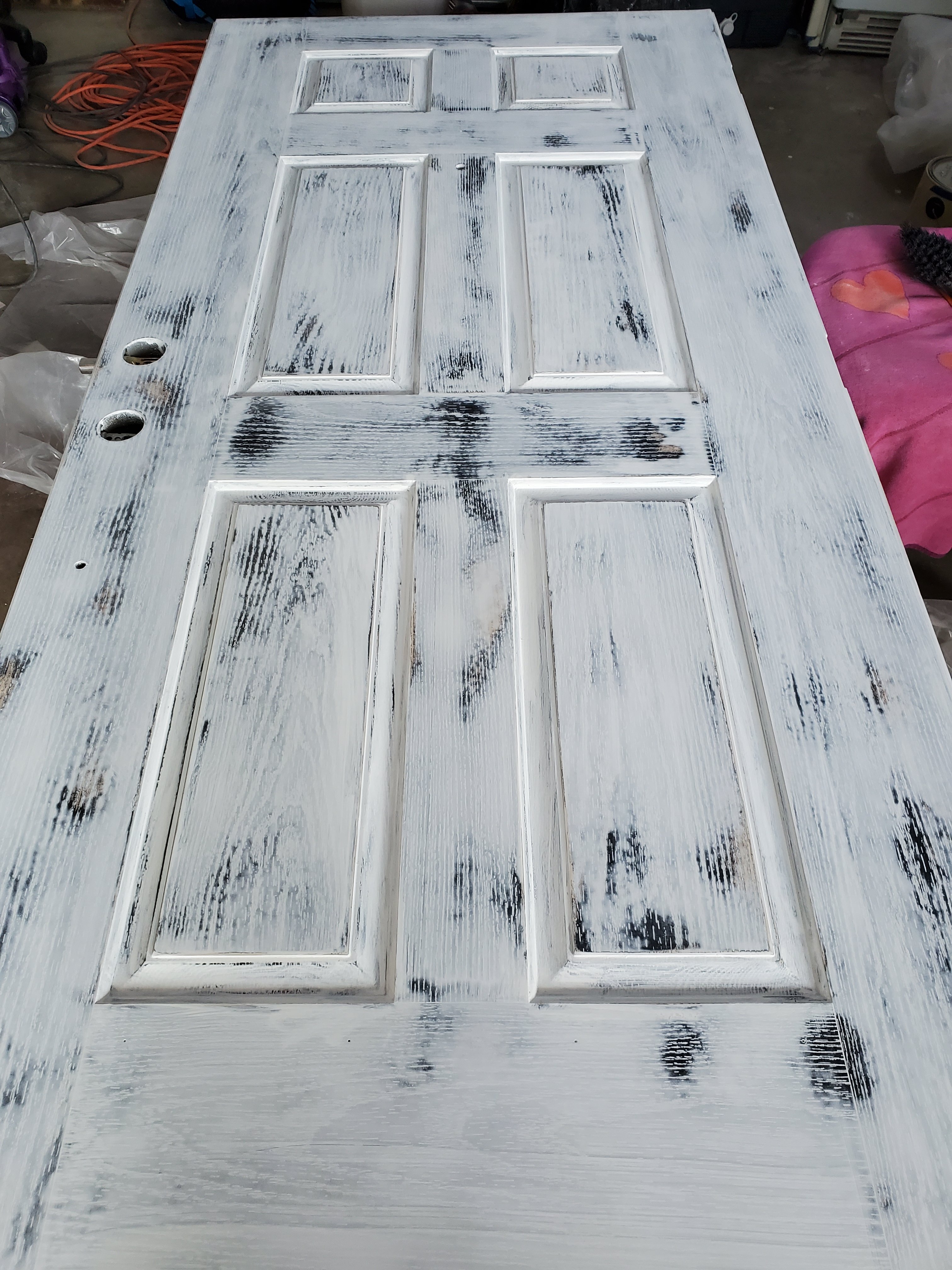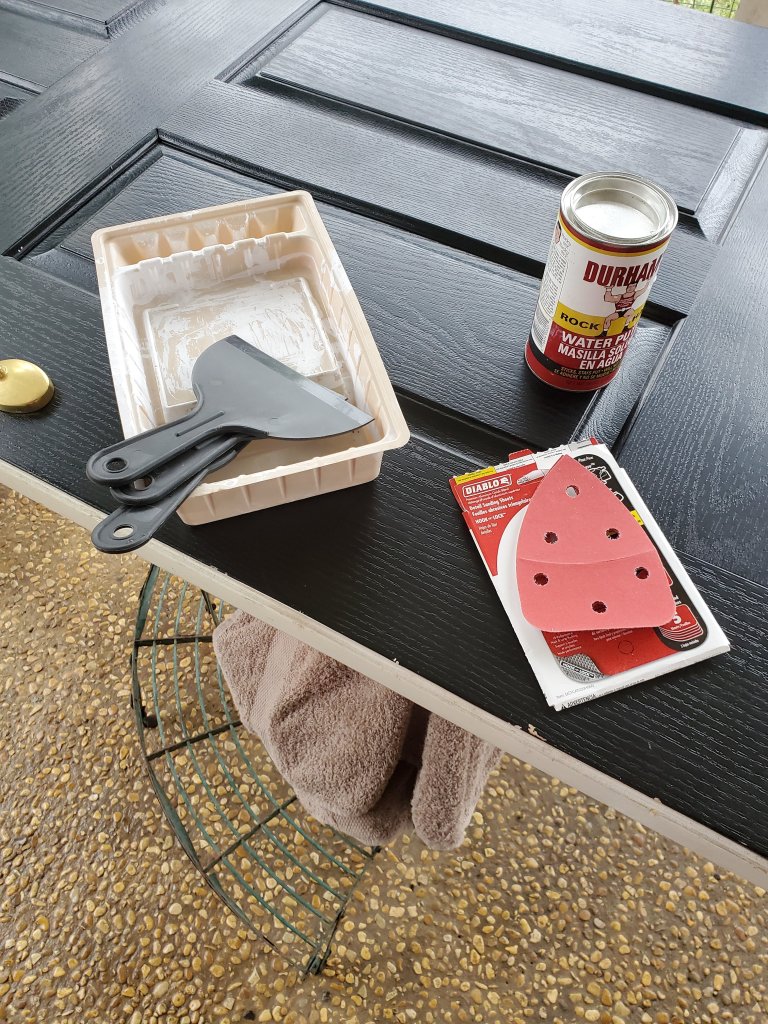 We sanded it down outside. It rained onto the door so we brought it back inside to let the door dry (this added to my time estimate.) We used “rock hard” to fill the fake wood grain they stamp these doors with. I didn’t want woodgrain to mess up the appearance we were going for.