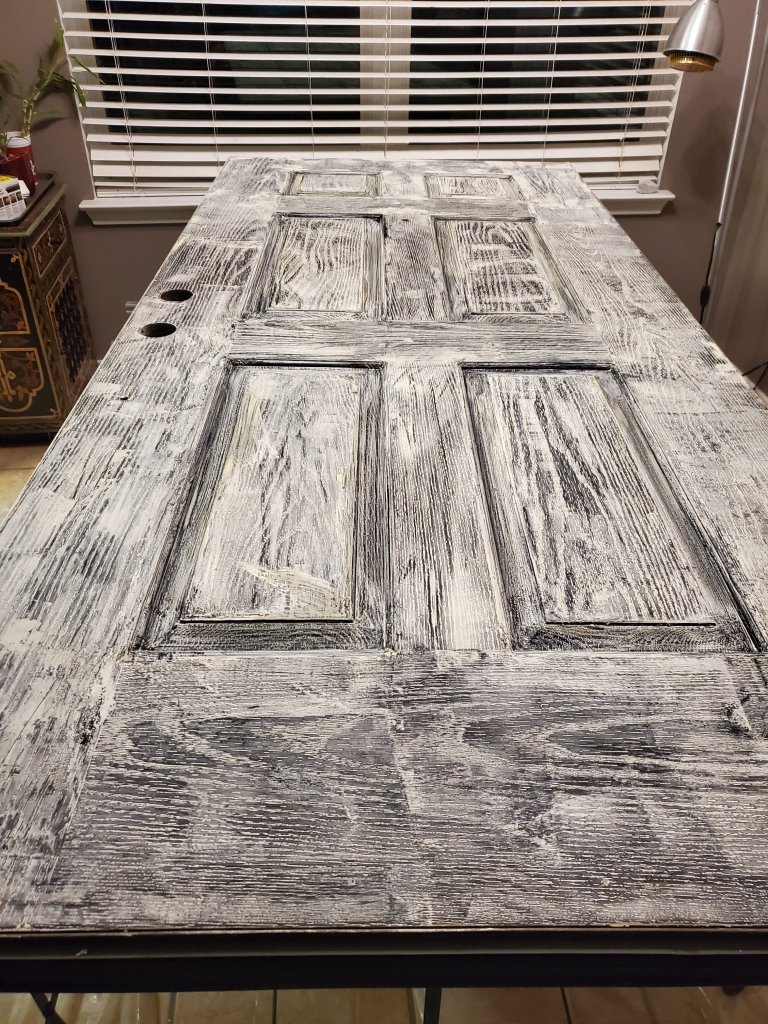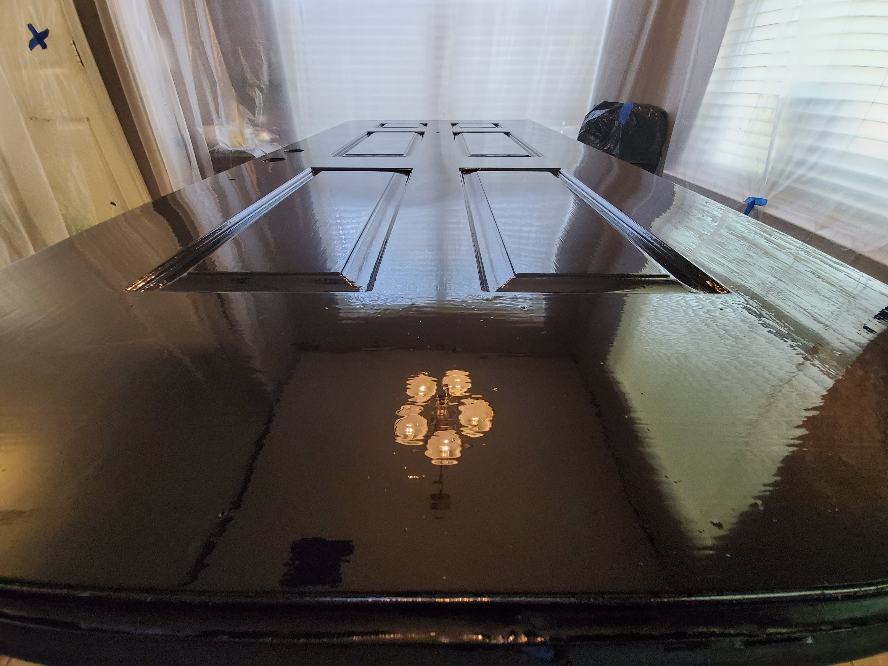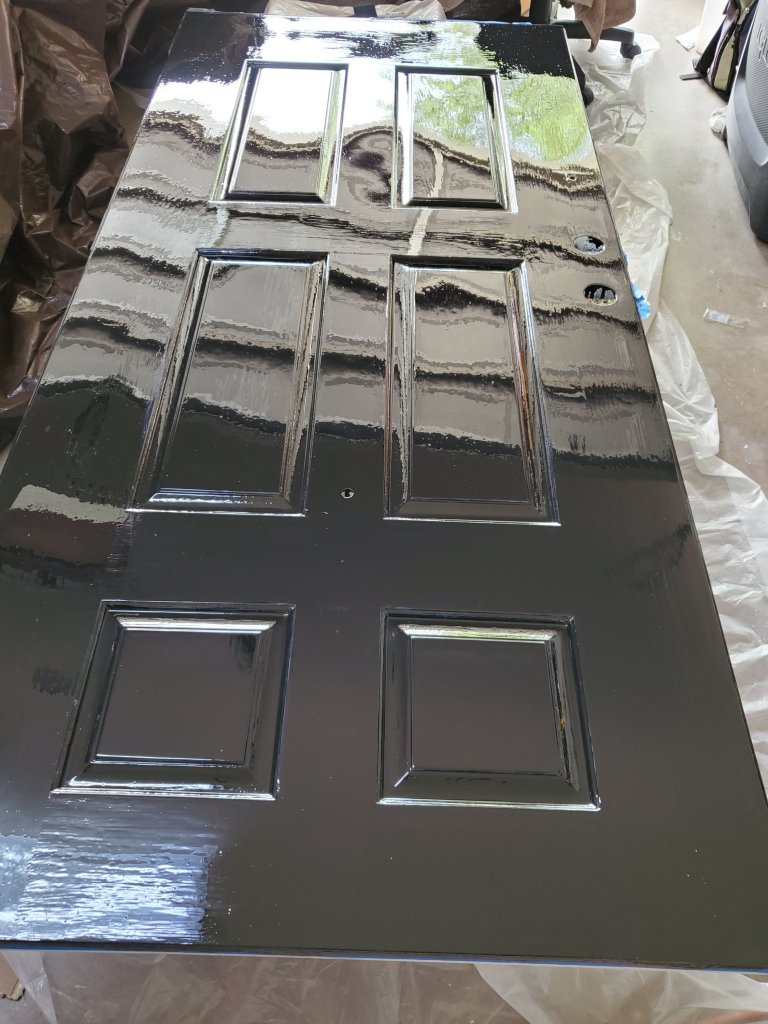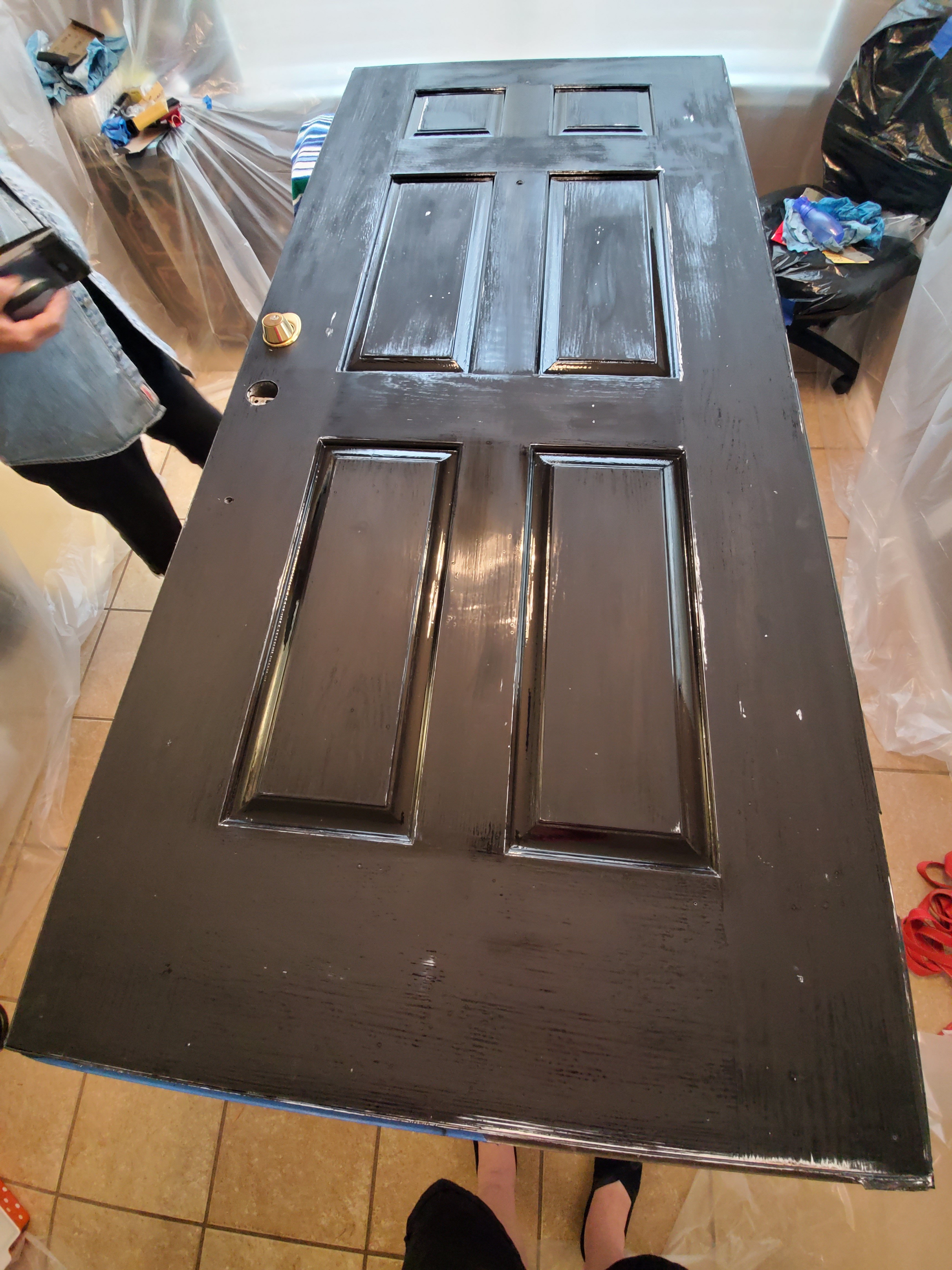 If you want to do this project my advice is this: create a clean room, spray the walls and floor with water during paint application, (do this several times until you can shine a very bright bulb and you don’t see dust passing through the beam of light) and when the paint is still curing, do NOT overwork the paint. If it’s not perfect: do another coat once it dries instead of running your brush back through it while it’s starting to set up, I didn’t sand between the last two coats and it was super hard to tell what was wet and what was dry, so try to remember where you’ve been, use a small foam brush for the drips in the corners (if your door has details), don’t bring in crazy bugs on the support for the door 🙄, get a space heater and heat lamps and run them during the day to speed up the enamel curing process (when you can keep an eye on the lamps and heater. Don’t do any heat overnight. There’s too many fumes and flammable plastic to run this stuff while you are sleeping), don’t apply the paint really thick because it won’t dry, don’t apply the paint really thin because it will not self level. After 4 coats we could have redone this from scratch with just two coats. There’s a learning curve (hopefully these instructions will help with that), do not allow your pets in the same room as the door, and wipe and wipe and wipe (and check in between wiping with a high powered light bulb to catch anything that drifts in or that your tack cloth leaves behind) before you add another layer of paint.