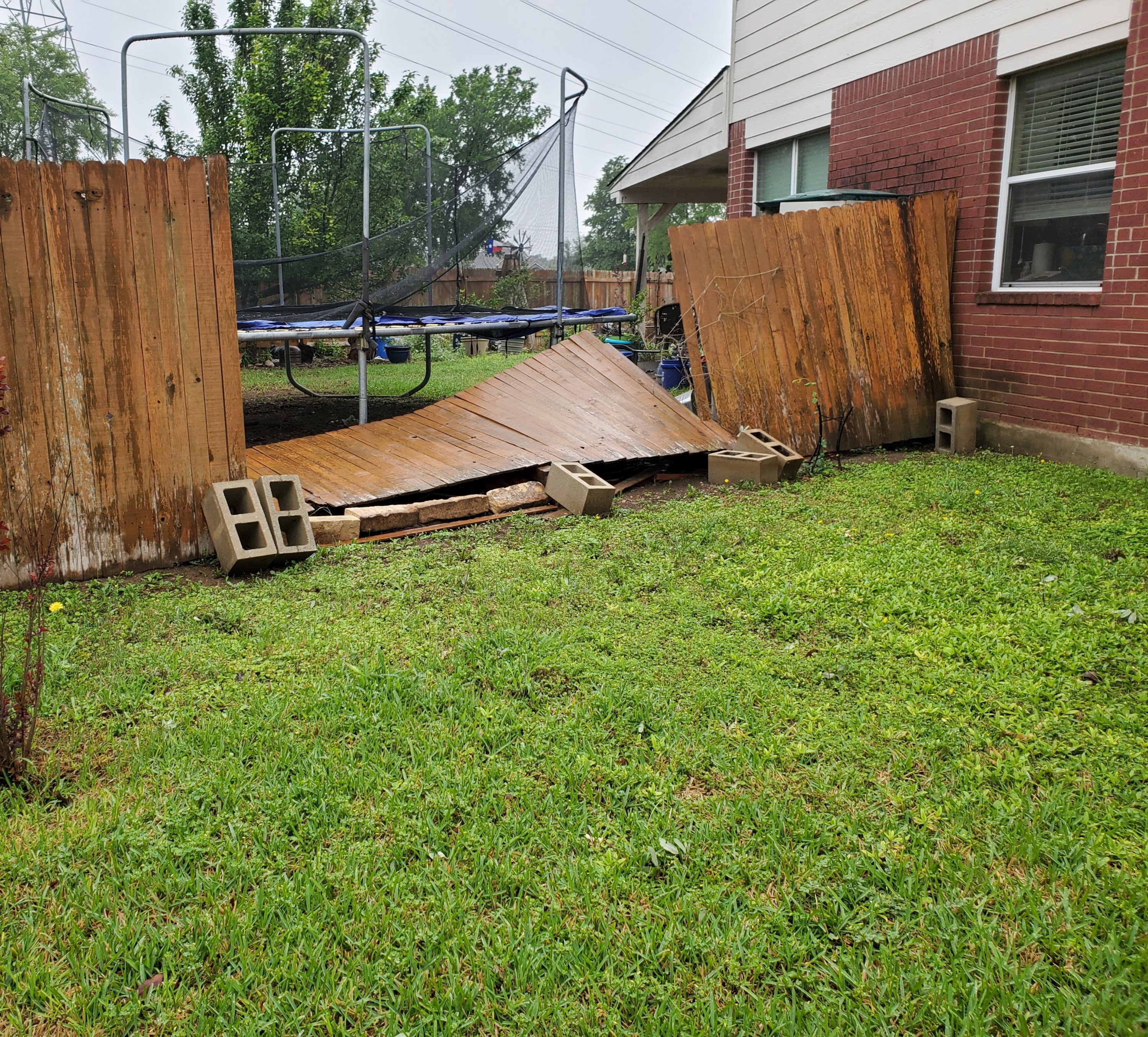 Anyway. Before you start this project know that your replacement door will probably not line up to just exchange knobs and dead bolts (and mine were so difficult to replace I had no interest in taking them on and off repeatedly!) Plan to not have your replacement door up for high wind and big storms. Your door won’t last long in high wind. We considered screwing the door into the frame with long screws but eventually decided, as long as there wasn’t high winds, the way we had it was fine. If you are in a high crime neighborhood, I’d screw the door into place. Plus. My stupid fence fell in the wind. So there was even more to fix than the door, from the storm.