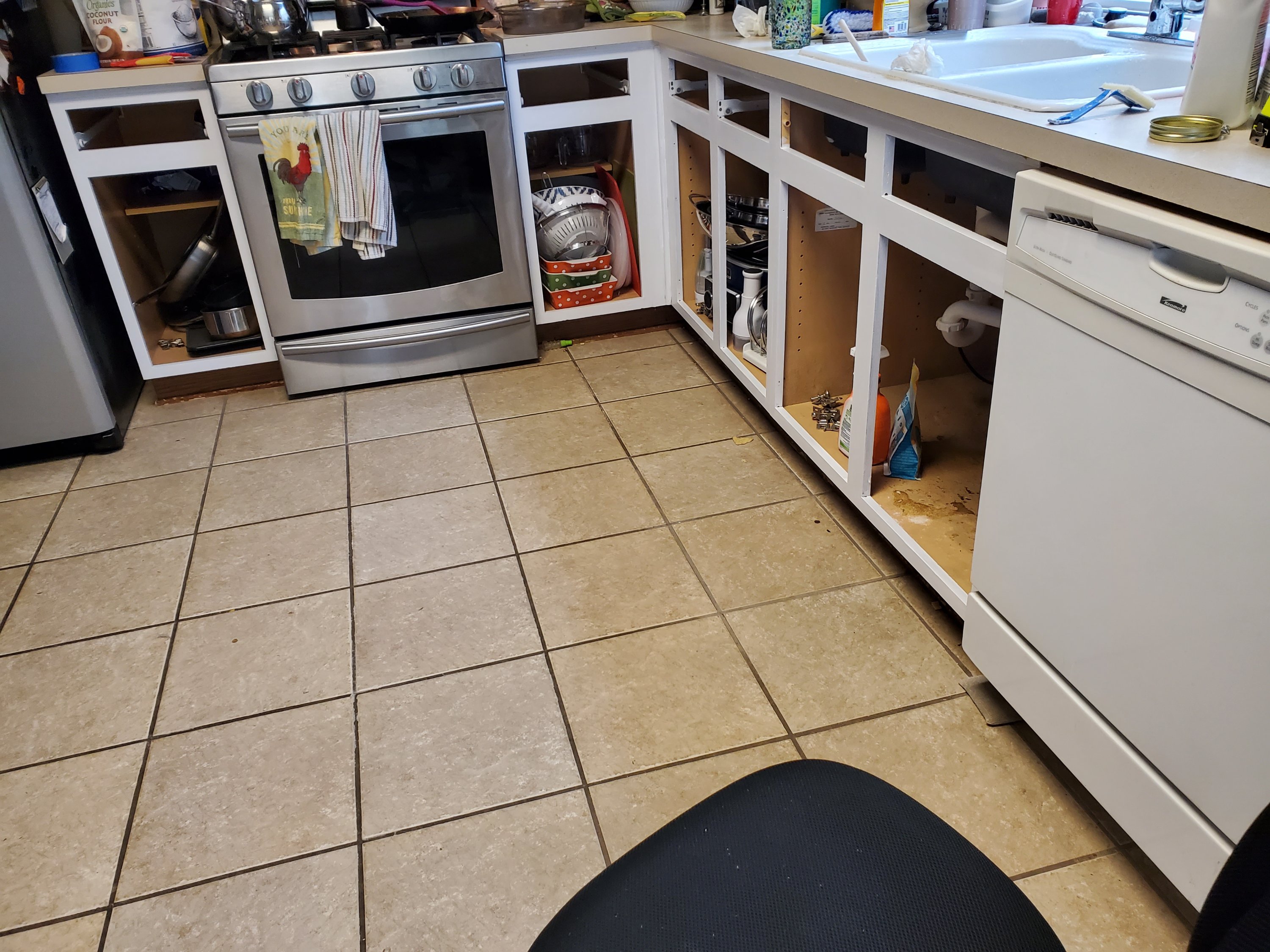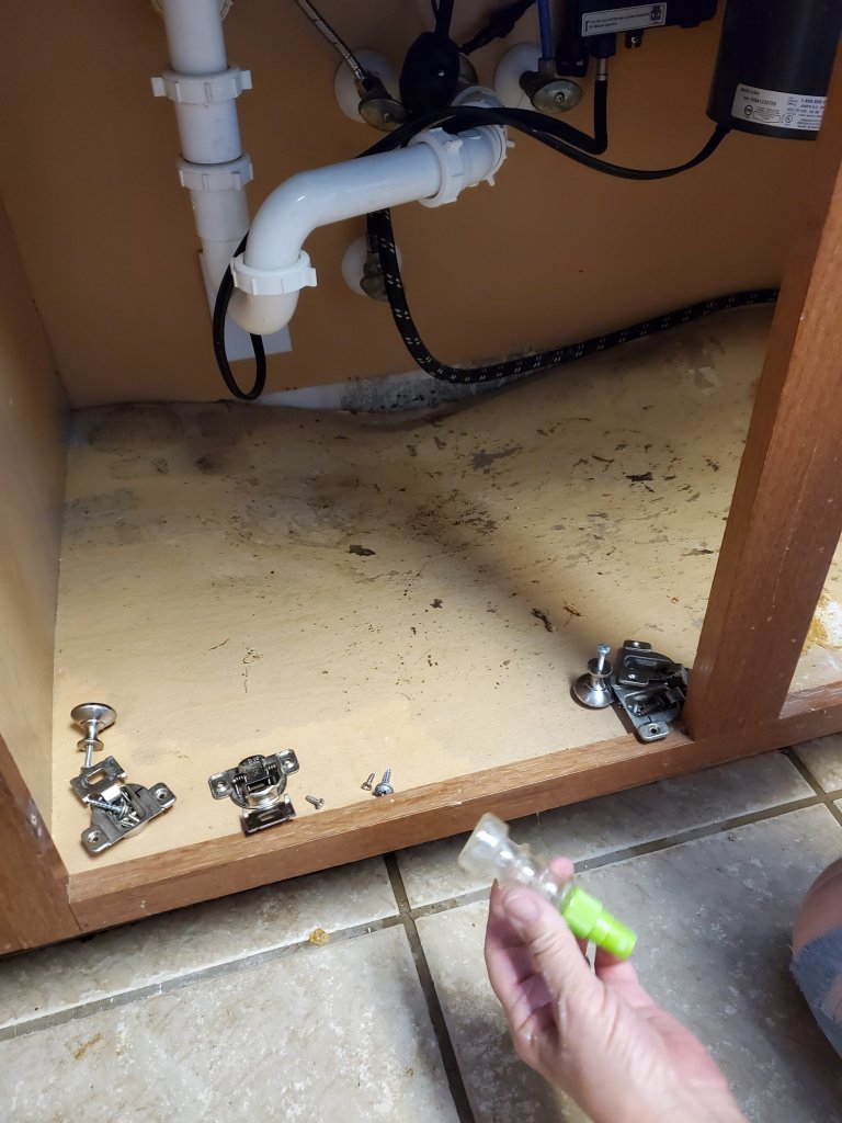 We discovered the leak, from my water filter, while my mom was here. Thank God my mom is a Jack (or Jane?) of all trades!