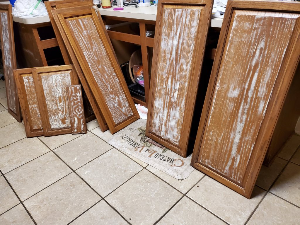 It was hard work. My kitchen and house were chaotic because: we took down the cabinet doors and drawers and removed all of the hardware. We labeled the hardware and placed it back in each cabinet and tried to remember where each of the the drawer contents were. Even with an electric sander and a paint sprayer, it was slow going.