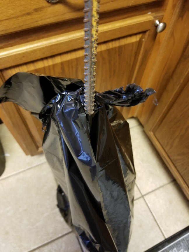 At the bottom (closed end) of your bag, cut a 3 to 4 inch hole in the middle. This will make some lengths you can tie on the rebar.