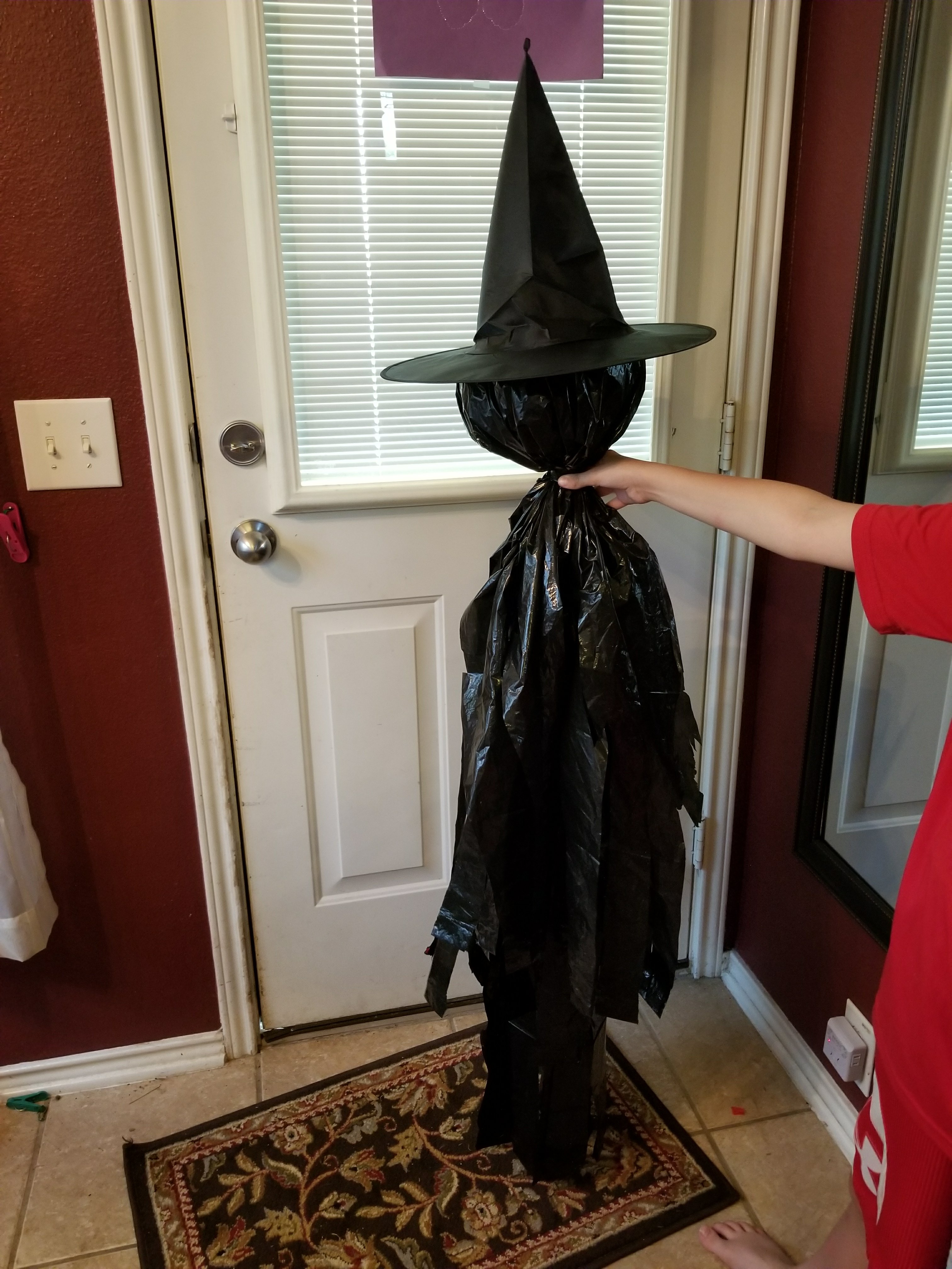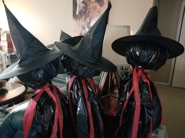 cheap bulk witch hats off of ebay or somewhere else online (I got a package of six here for about $10.) To get cheap witch hats outside of listed as “in stock” ones on Amazon, you will literally need to enlist the help of a slow boat from China. If you do not have Amazon prime, and you order directly from China, this needs to be ordered at least a month ahead of time to be sure they arrive in time. Always check when they estimate delivery for anything you order online. If it’s too late to get the hats, just switch to white trash bags and you can make ghosts instead. For ghosts: use these directions, omitting the witch hats.