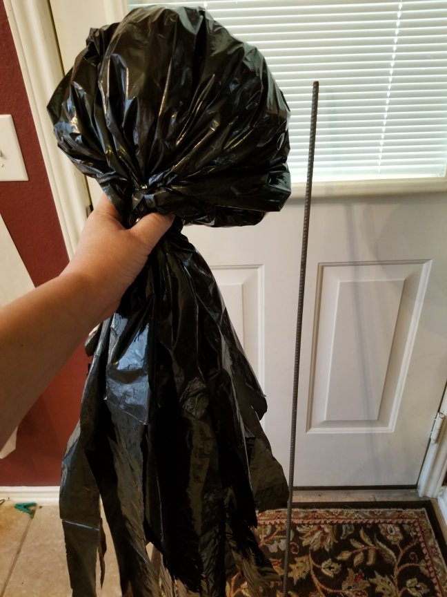 Take one of your cut up “dress” bags and slide the rebar through the center that you cut. Put the end of the rebar on the ground and bring the bag up, so that: the strips hang like a skirt around the rebar. Tie the center edges that you cut together.