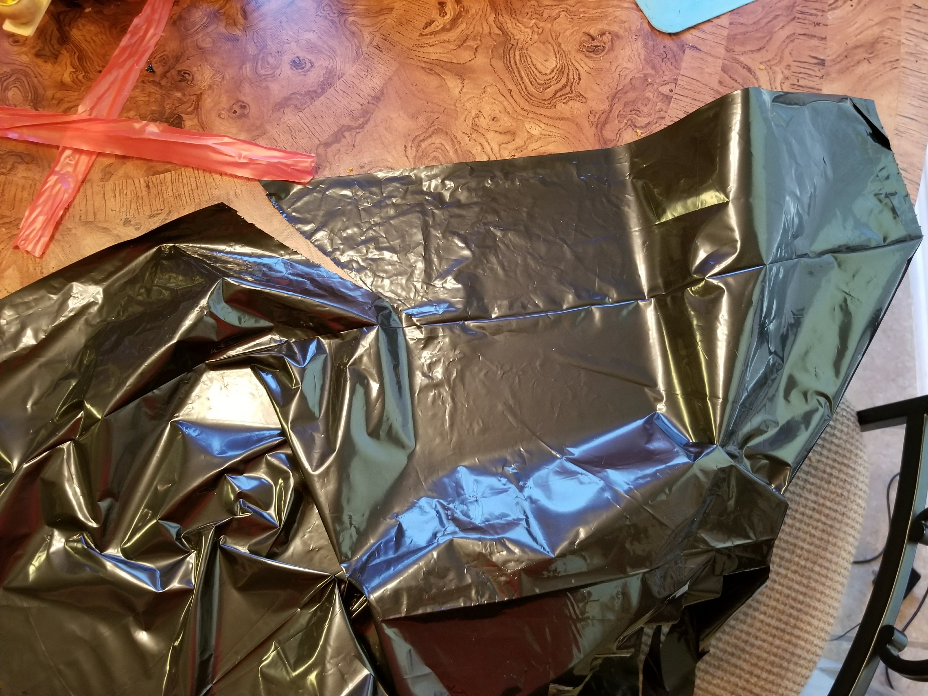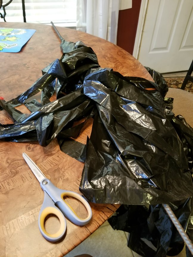 Now let’s get down to the witches! The first part is cutting up your lawn and leaf trash bags. First pull out the tie strips (if you have them) and cut them off as close to their base as possible on all three bags. Don’t throw the ties away! You can use them in a minute.