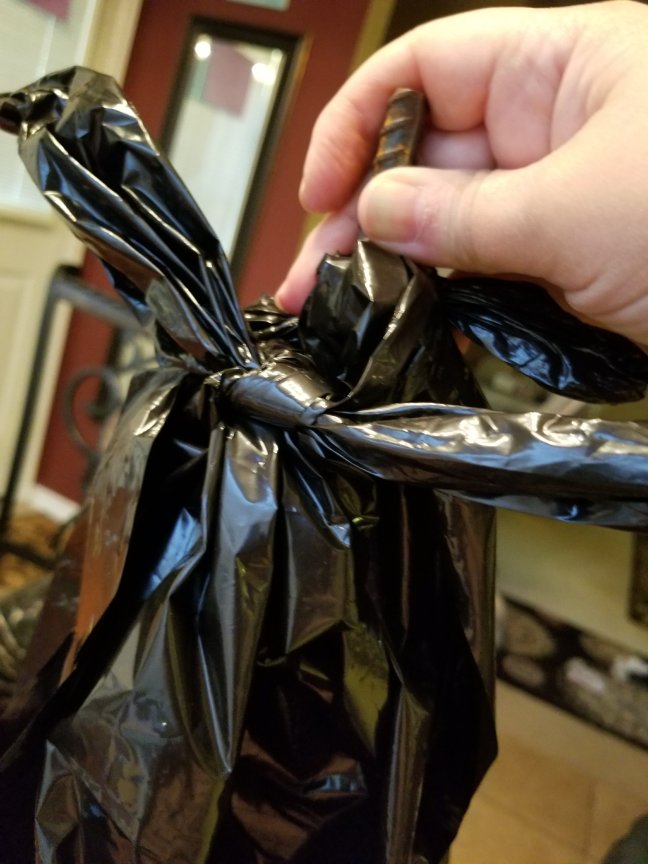 Then tie the ends (of the corners of the closed end of the bag) together. Tape the knot ends in the same way you did the center cut knot.