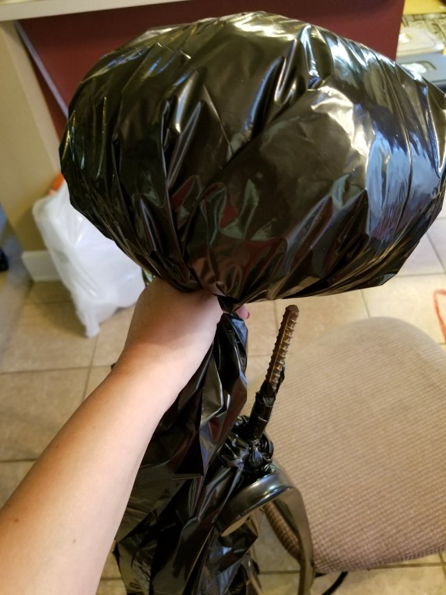 Take your 4 foot rebar (these are always rusty so make sure you don’t do this over carpet/upholstery or while you are wearing nice clothes!) and slide your witch’s head onto it. As you are holding the head, fold any excess or corners down around the rebar.