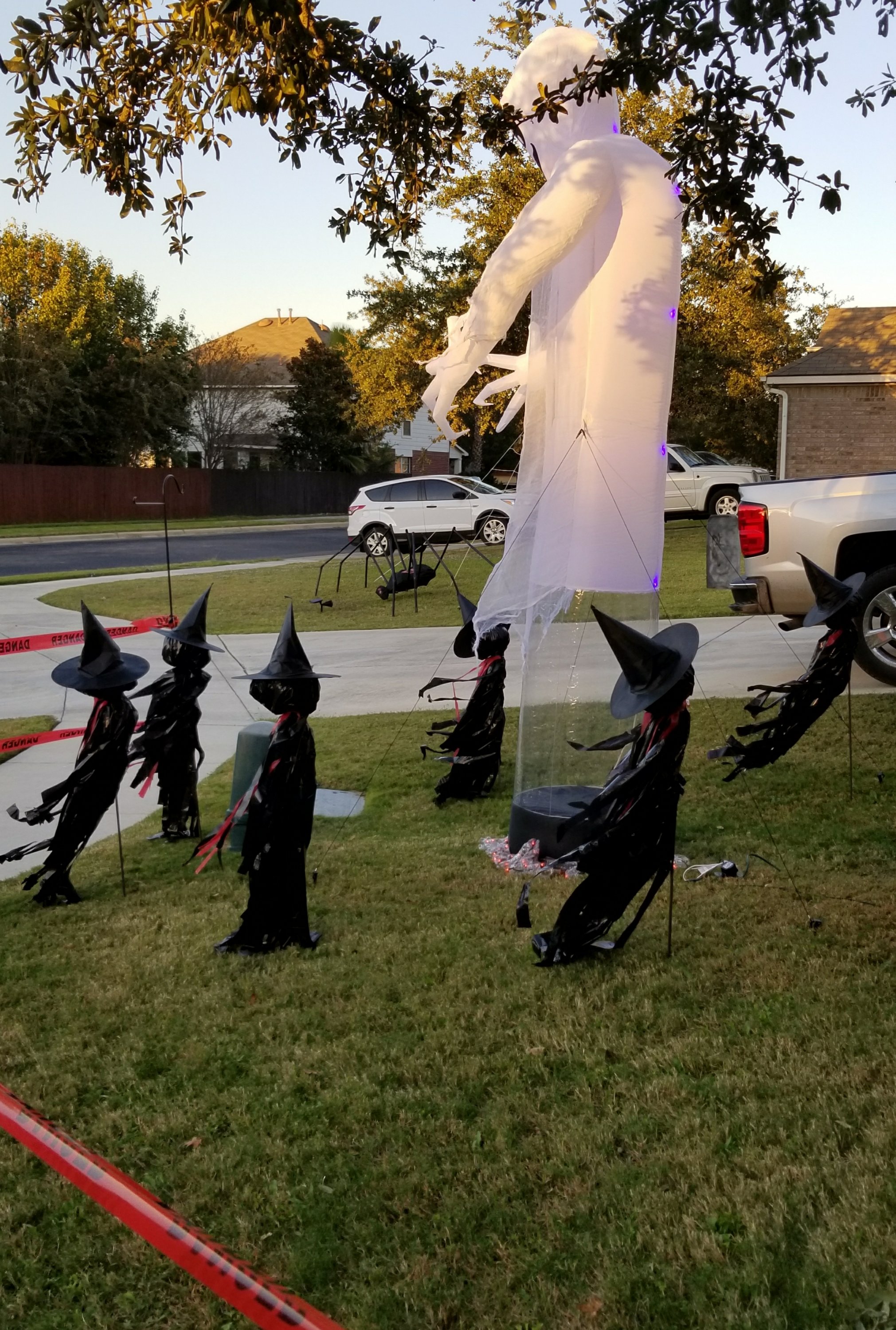 It’s a circle of witches, and it turns out even better if you have something for them to stand around. This year we got a 12 foot blow up ghost on a half price sale. My witches are going to make my 12 foot ghost even more impressive!