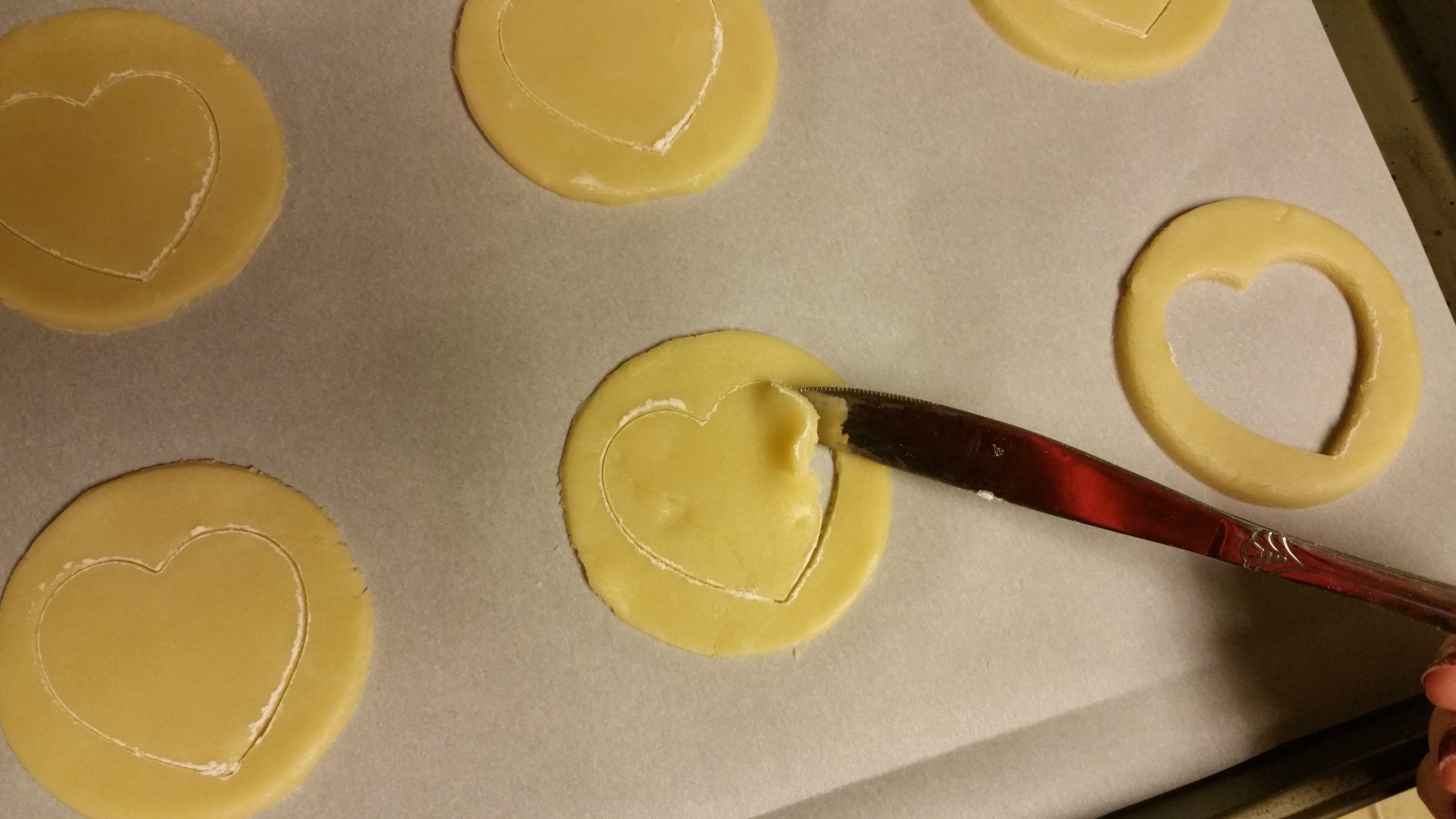 After you get your cookies cut out (and before you cut the second interior shape out): put them on a room temperature cookie sheet lined with parchment paper. (Yes. you definitely want to use the parchment paper and not just a non stick cookie sheet.)