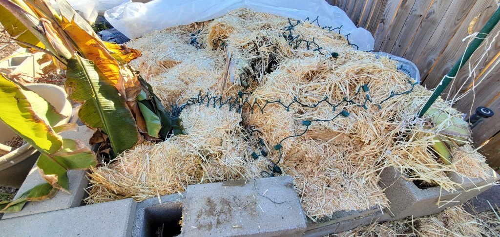 So, winter 2022: I have the bananas wrapped in mini Christmas lights and covered in layers of straw. I put a large plastic tarp over the bed. Tonight we’re in the mid 30s. The next two evening’s lows are in the upper 20s. Then we’re back into lows in the 50s. Hopefully, my banana experiment is going to work out.