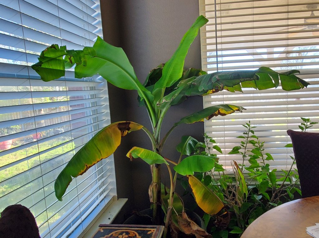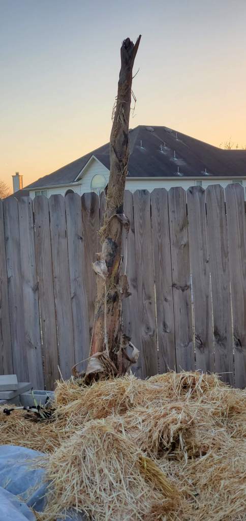 My bananas have been in their tarped bed with Christmas lights for warmth. (see here: Putting Bananas To Bed For The Winter Zone 8b) I’m hoping that the stems made it. Otherwise I will be putting out the two bananas I brought inside for the winter. One of which is a 9 month fruiting banana and I could possibly see fruit from it this year.