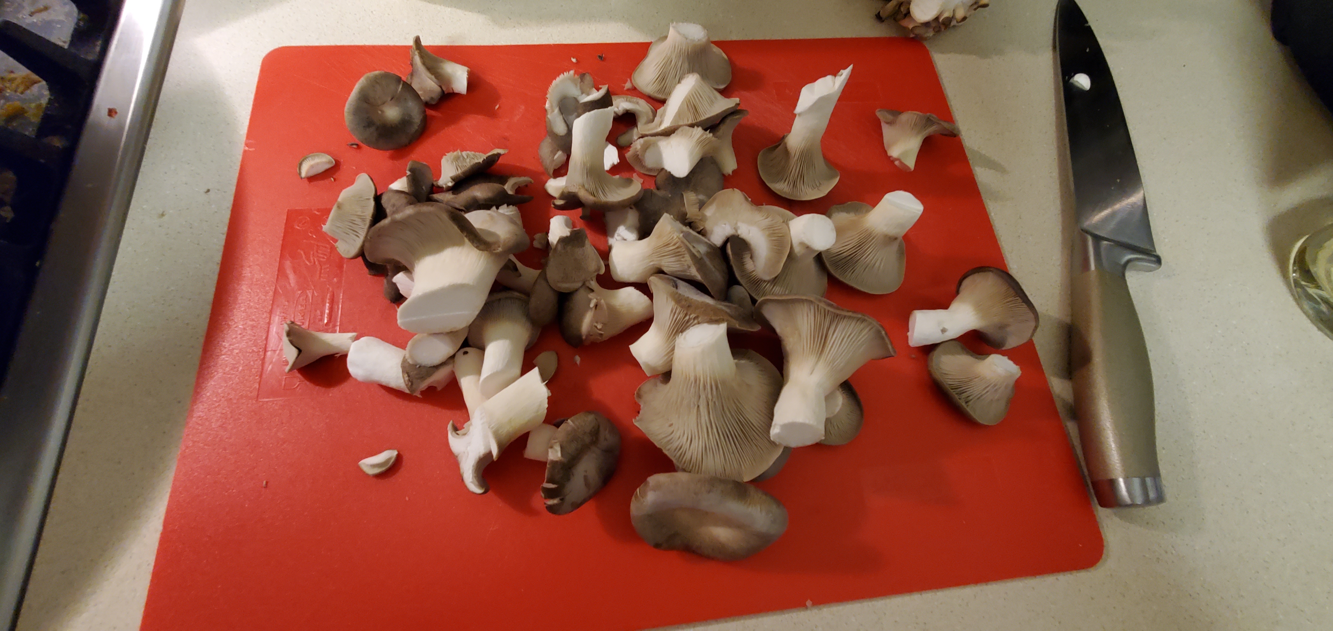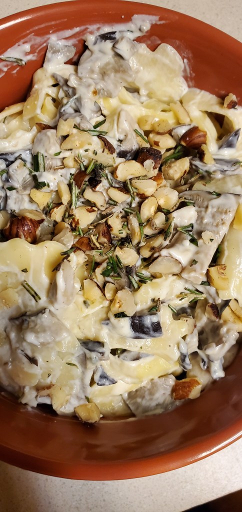 I will say, this may be the simplest, best recipe I have ever made with mushrooms. Even my 12 and 14 year old kids liked this. I am definitely putting this in my monthly rotation. I will use button mushrooms, from the grocer, when I don’t have any homegrown mushrooms available. Button mushrooms are cheap, easily available and really don’t taste dramatically different than the black pearl mushrooms I grew. This is the recipe: https://more.ctv.ca/food/recipes/wild-mushroom–hazelnut-and-rosemary-tagliatelle-with-creme-frai.html
