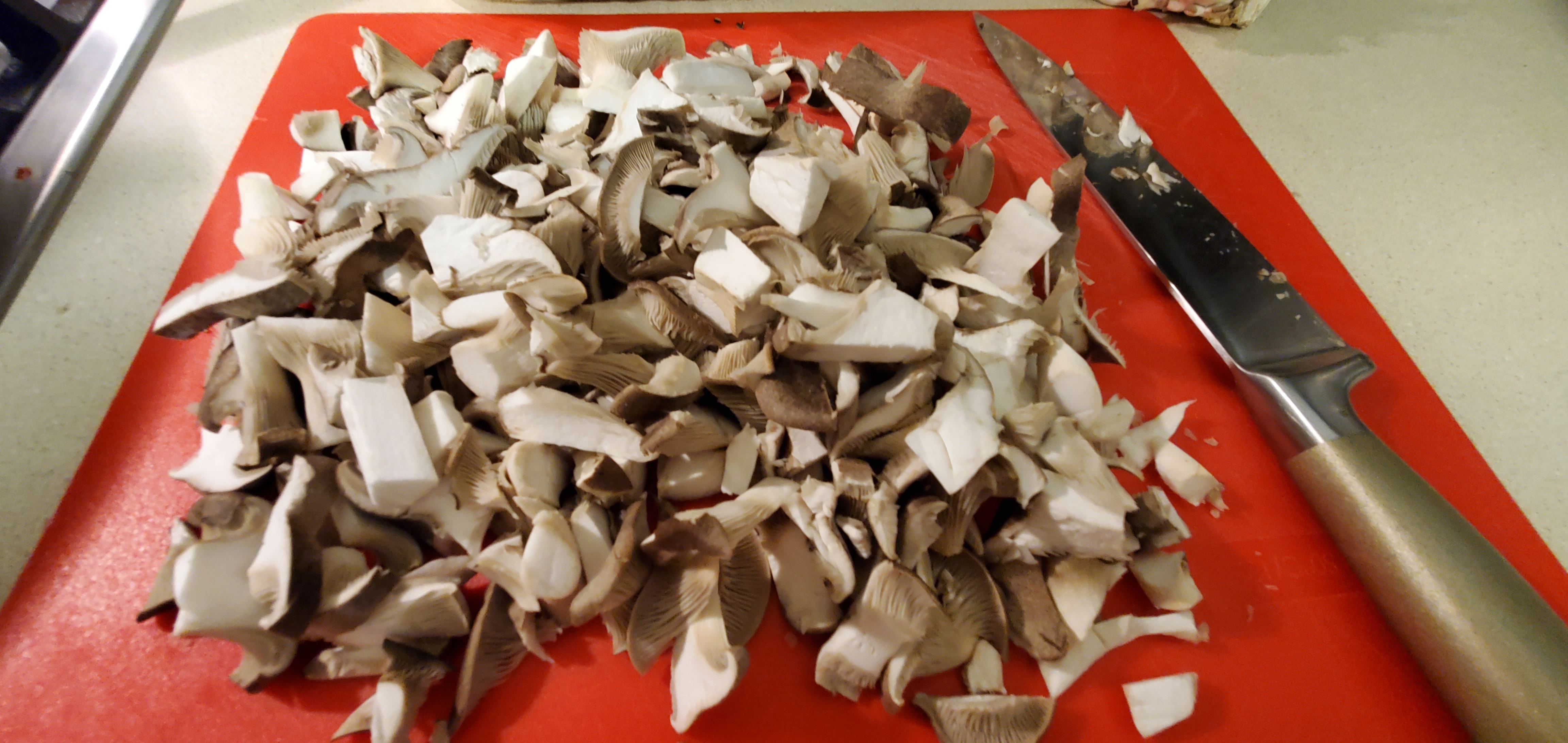 After I made the pasta recipe I ran the rest of the mushrooms through the slicer on my food processor. Then I dried the mushrooms in my oven, which has a dehydrator setting. You can save mushrooms sliced, dried and in a glass mason jar in your refrigerator for up to a year, or you can put the dried mushrooms back into the food processor and powder them and keep them in the refrigerator for the same amount of time. This is what I plan to do. I will be able to add mushroom flavor to anything I’m cooking. Had I grown more than one block I would have done both powder and dried slices. Mushrooms rehydrate well. But I really like having powdered vegetables. Carrots and celery make great powders too. Although watery vegetables like celery and mushrooms dry down to almost nothing, so it takes a lot of fresh celery or mushrooms to make much powder.