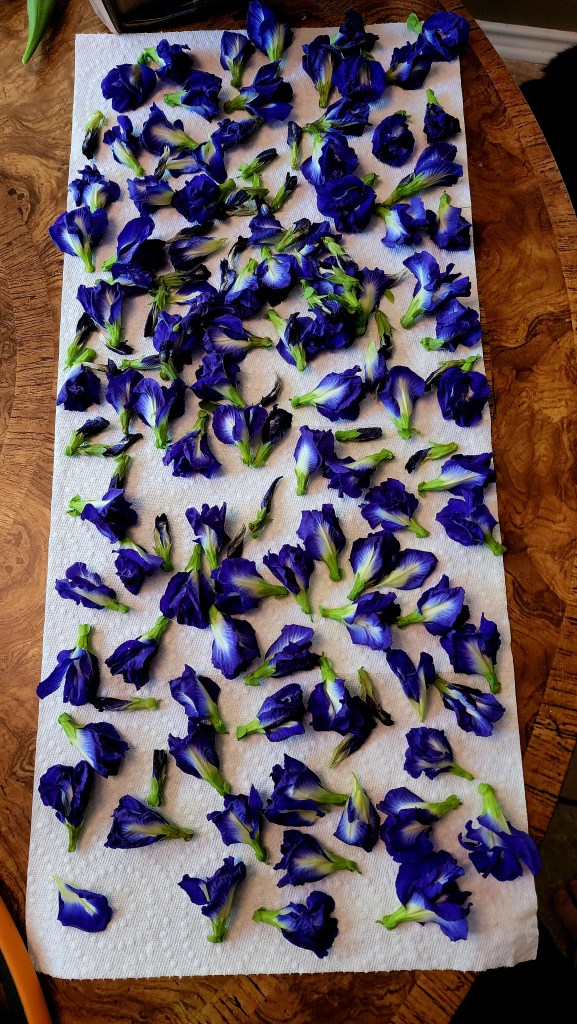 Drying freshly cut butterfly pea flowers. I will never use raised bed space for these again. They are completely out of control with the conditions in my hugelkulter/Lasagna beds