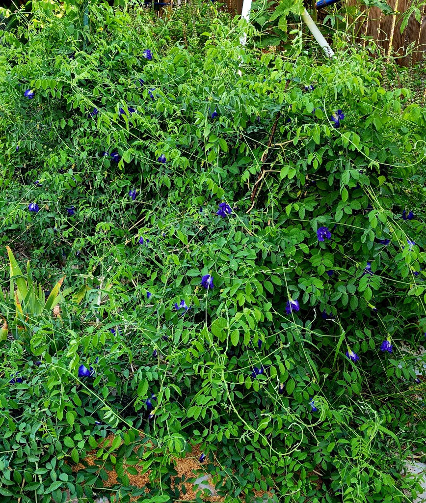 Just three butterfly pea plants. I tell you what, these butterfly pea plants are powerhouses for blooms that you can dry and use for dye or antioxidants. Dry them and remove the sepals and grind them up in a food processor. Then you can add them to anything. It’s fun to add them to Chai, or even just milk, and have a blue milk tea. Fun to serve to your family or neighbors!  Unlike regular peas these plants grow and flower heavily in the heat.