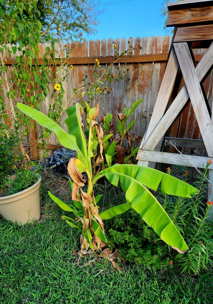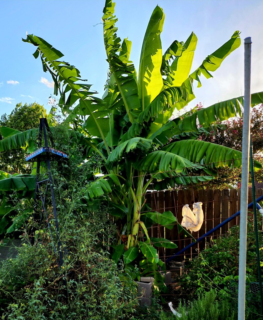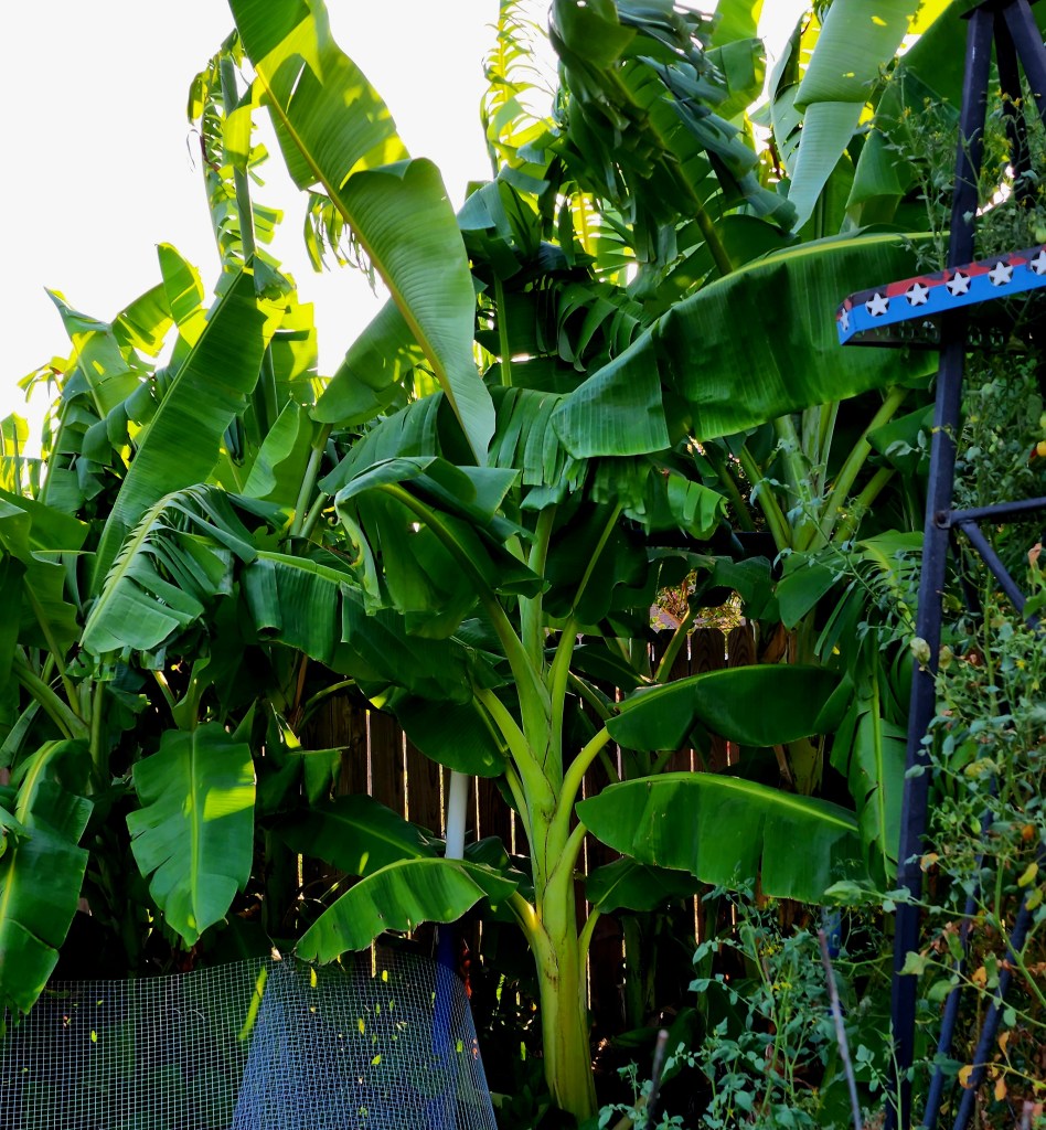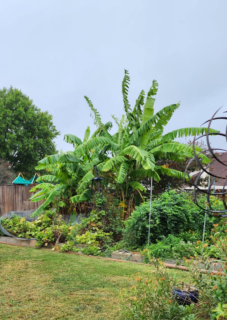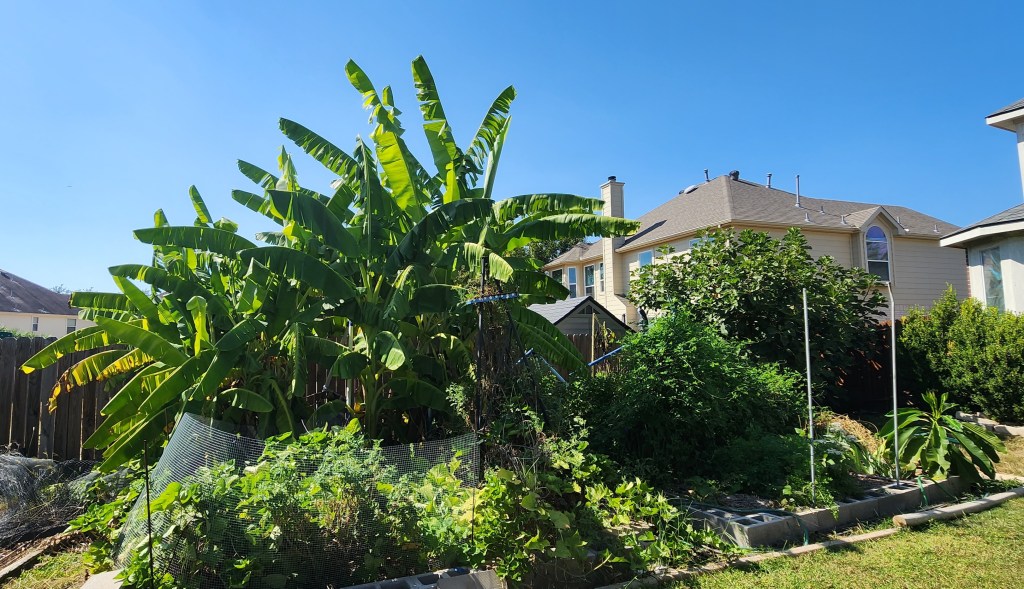 My bananas, end of season, in deep raised beds. The tallest one has come back for three years outside now. It grows larger every year. The first year it was outside was our winter with snow and a low of – 16°F. I think you could grow bananas this way a zone or two lower than mine (8b) because it lived through that super unusual temperature. BTW that’s a 6 foot privacy fence!