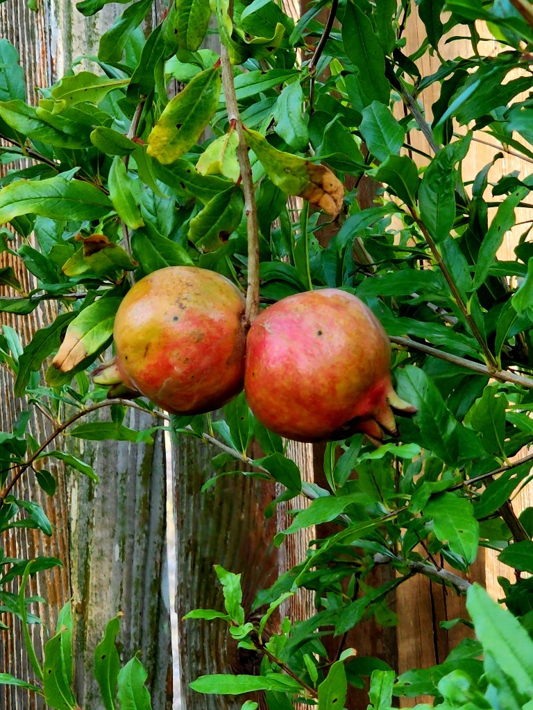Ripening Parfianka pomegranates from Raintree nursery. This bush survived our -18°F weird winter, a few years back, and is back in production. This year we’ve had almost zero rain which has kept the fungal disease pressure low. My pomegranates are ripening well and haven’t been attacked by mice and rats. It seems that the rodents have concentrated on my fig tree, which at this point I don’t care about because I have a bunch of figs frozen right now, ready to can.