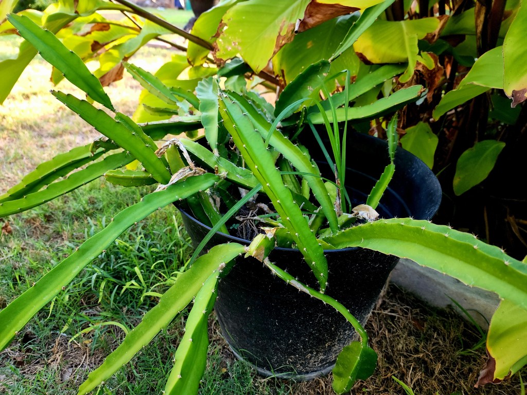 This is a dragon fruit. It’s a night blooming Cereus, which is something my mother grew for decades. We had a perfect spot for her plant in Colorado and it did bloom. The fragrance in the house was overwhelming. I had no idea it was a part of a large cactus family that includes dragon fruit. This is a live plant I got from rareseeds.com which is the Baker’s Creek site. This is a variety that a cute little old man (Edgar Valdivia) created, he has videos of his dragon fruit farm on YouTube. This variety has pink flesh that’s supposed to be very sweet compared to the white fleshed ones at the grocer. It burns in our heat so I have canna shading it. Hoping to get fruit when our nights cool off a bit. A tour of Edgar’s garden: https://youtu.be/Fuwe_LjDIOc