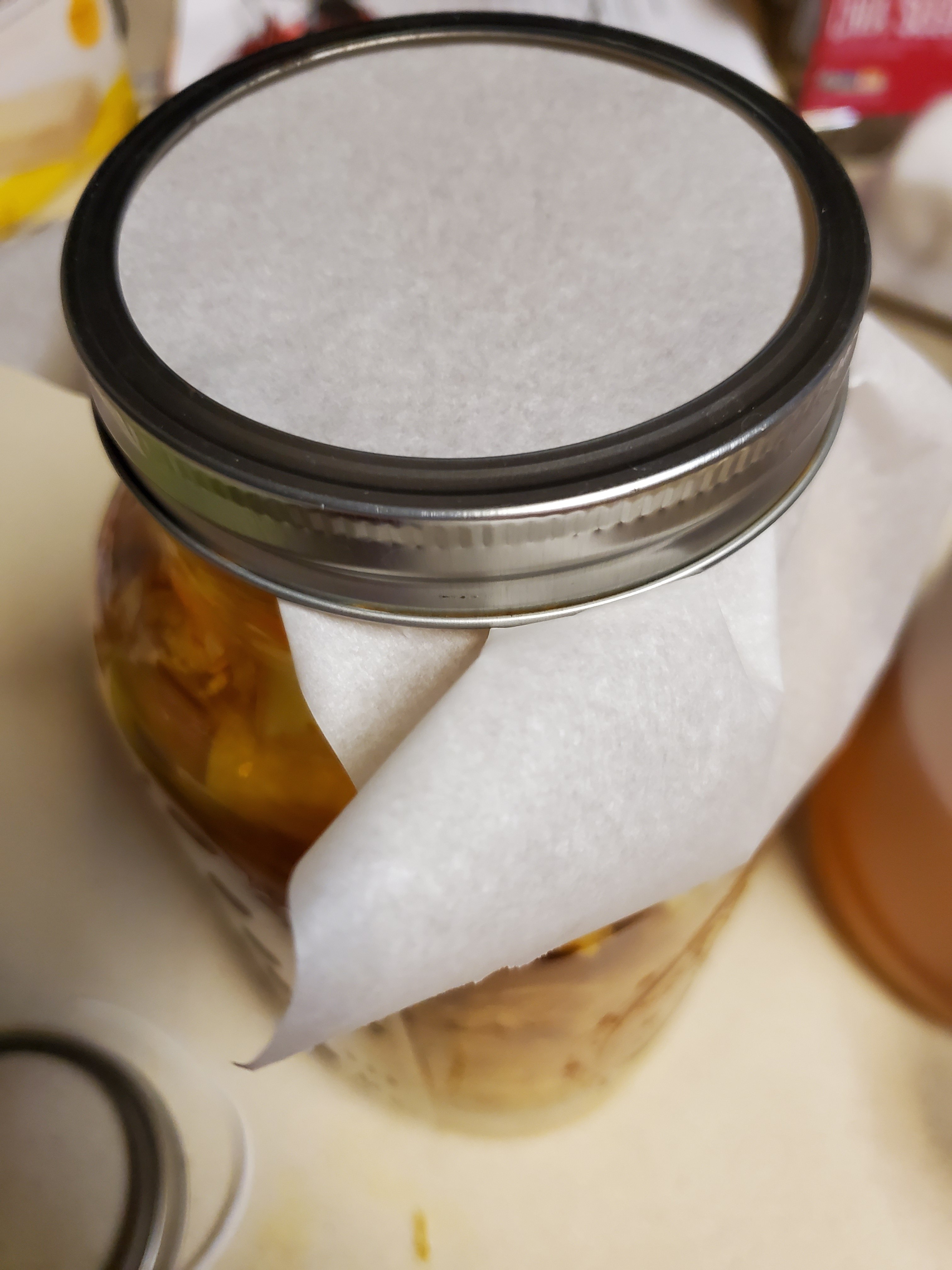 Put a parchment paper cover across the large jar’s mouth and put the jar ring on and tighten it down.