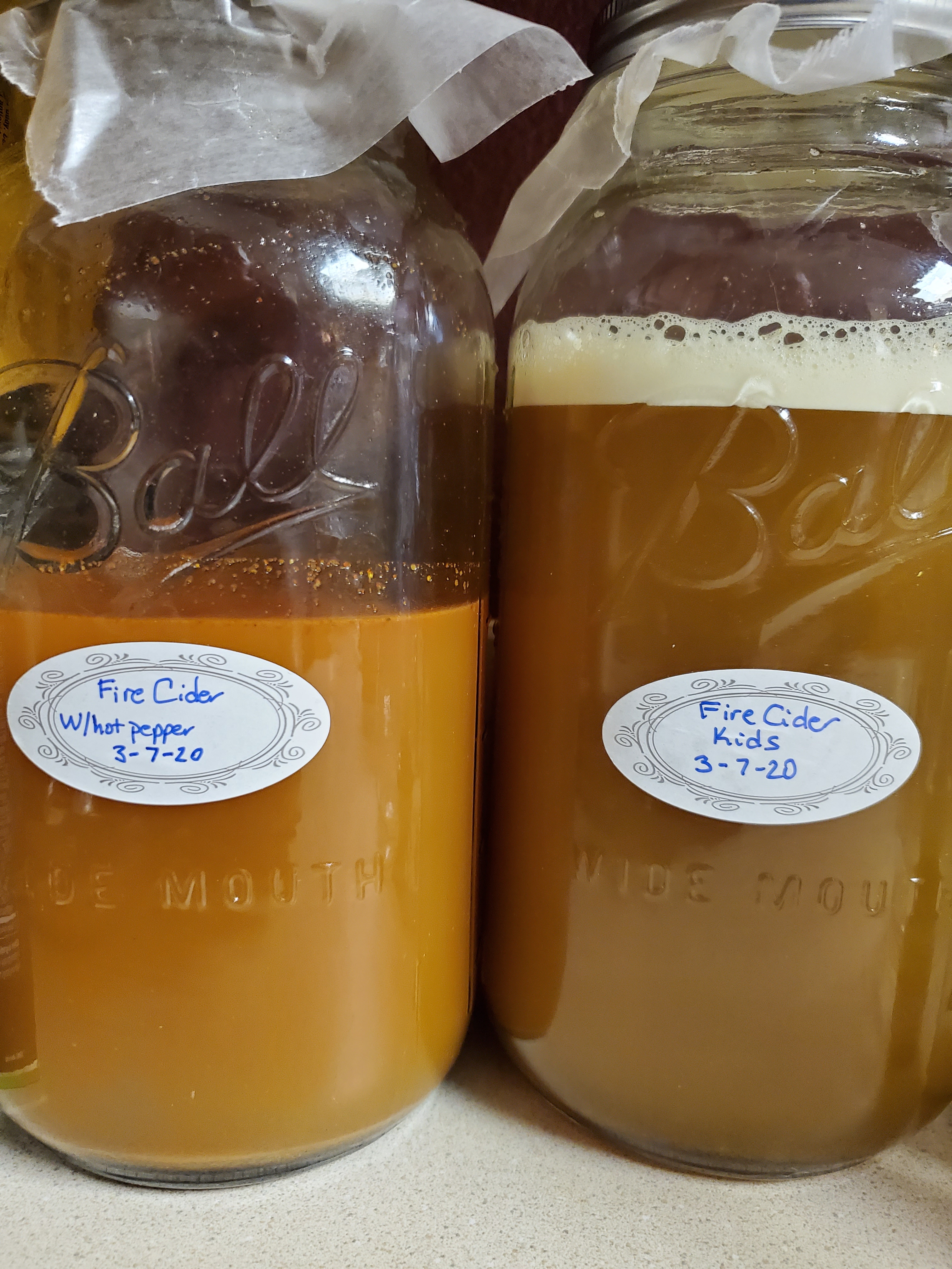 Two fermenting jars and a large jar of finished fire cider. I reused the ingredients that I strained out of the first batch and just added more vinegar to the strained solids. The two smaller jars have been fermenting on the counter for a couple of months and I have had no spoilage or mold growth.
