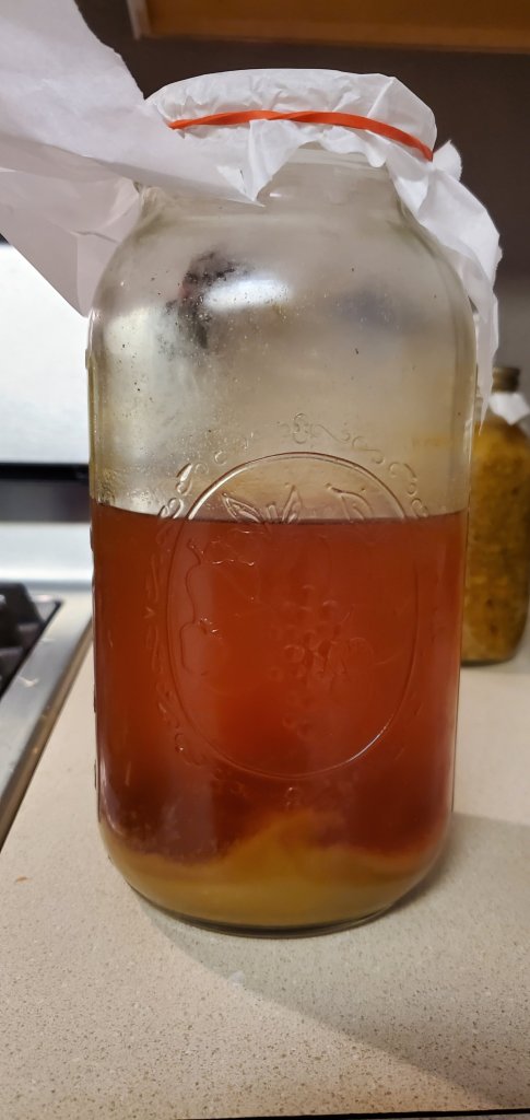 If you want to add a vinegar “mother”, it can be added directly to this recipe at the bottom of the jar, or add just the liquid vinegar from a jar with the mother in it. They are both inoculated with the same thing. I used a half gallon of cheap apple cider vinegar and added some Bragg’s vinegar, on top, that has the mother in it.