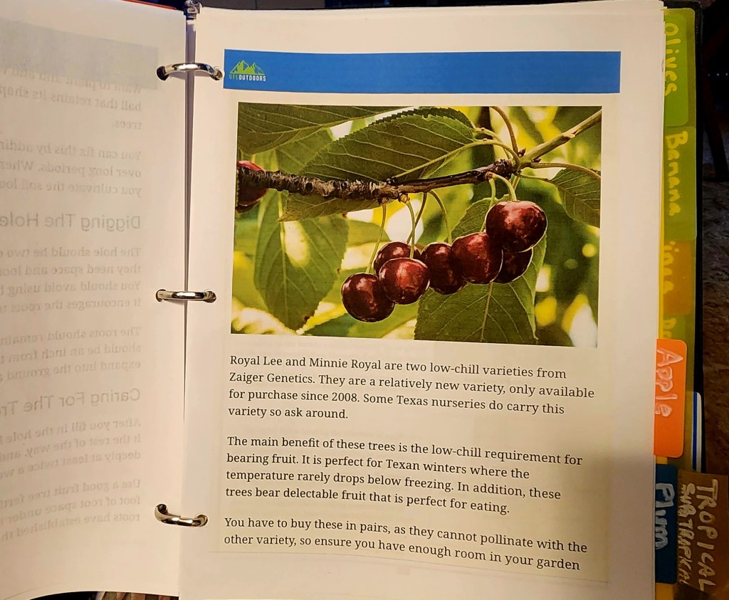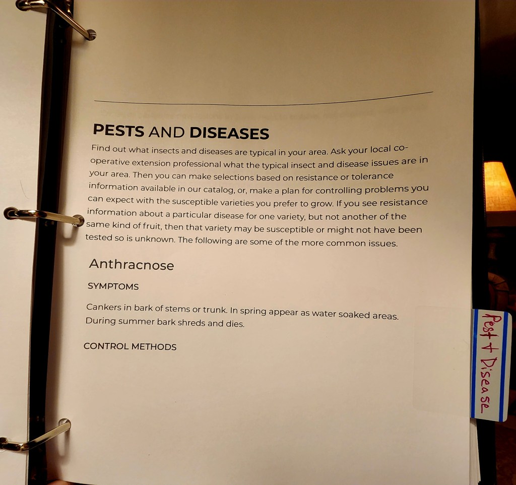 Within the dividers I have generalized growing needs for the types of fruit I’m growing. For instance: pears, persimmons, cherry, apple and plum. I pull this information from my county extension office and print it out so that I have a hard copy of the information.