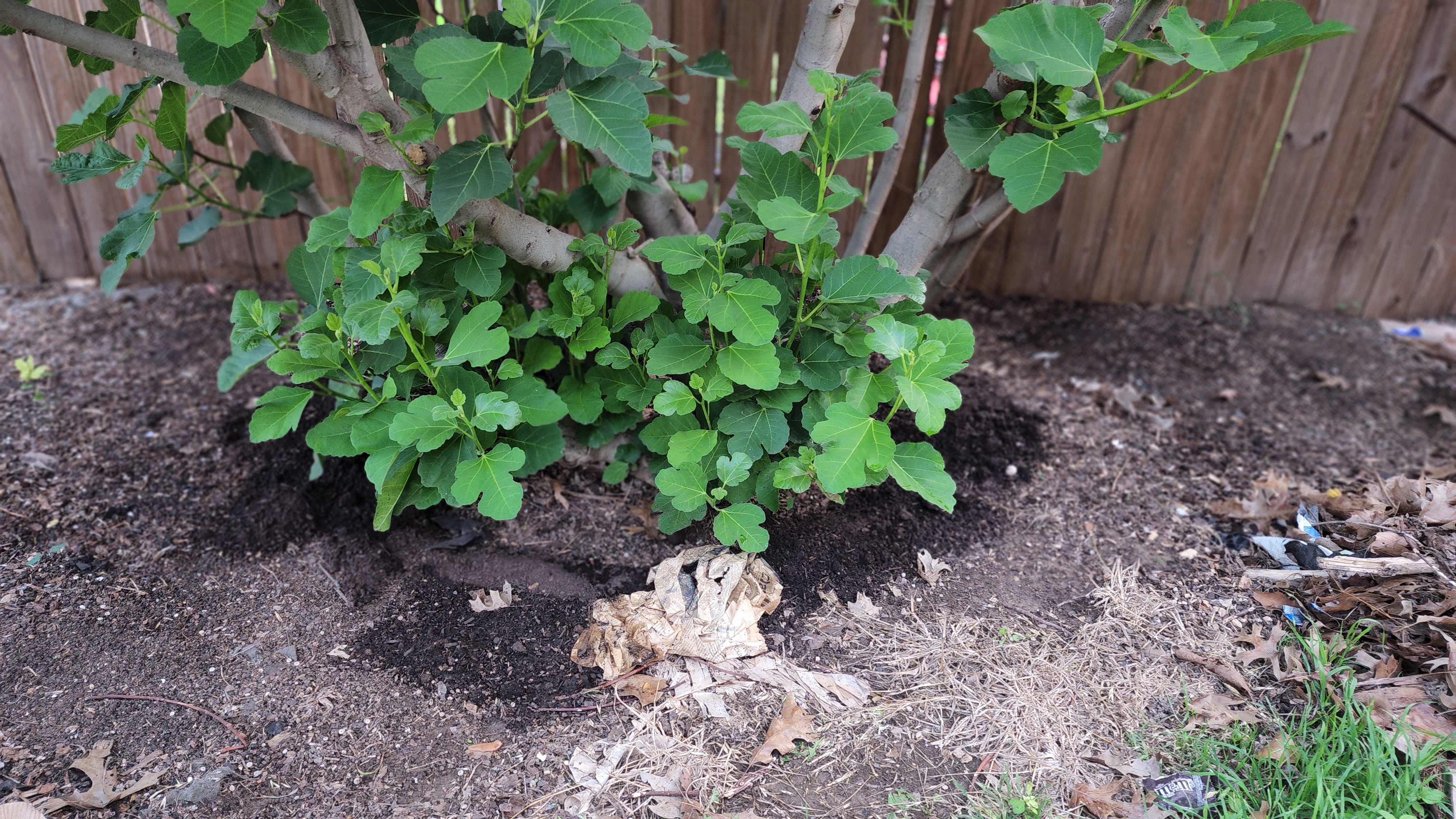 A bag of Black Kow composted manure under my fig tree. I prune this into a fan shape. Figs are very forgiving plants and I will remove the growth at the base when it gets in the way of our gate and the mowers. My fig has issues with fungal disease at the end of the year. I rake up and dispose of fallen leaves and spray it with copper fungicide in the dormant season.
