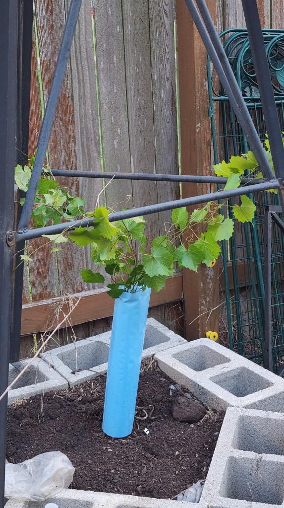 I have a second year muscadine grape this year. I built up a small raised bed for it since they prefer more acidic soil than what I have. There’s a plastic bag lining the sides and a little bit of the bottom to conserve moisture. On the to-do list is a support system.