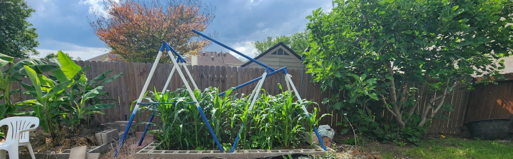 Wide shot of part of the banana bed, current corn and the giant fig. I use the old playground supports for the bananas. I need to move them over into place!