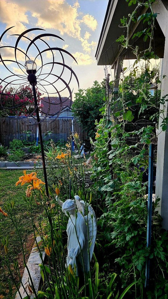 I have four raised vegetable beds that are based on a combination of hugelkulter and lasagna gardening. Our land is a little over a quarter acre and I have plants tucked into every place I can fit them. We still have grass for our kids and dog, but there is a lot of amended soil (amended by me, over the years) surrounding the grassy areas and that’s where I grow my vining veggies and flowers.