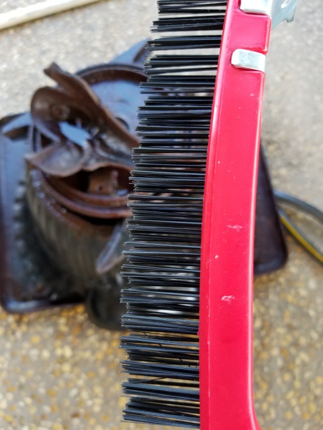 It took a fair bit of time to remove the rust around the details. It’s also late May in Texas which means it’s 🔥 HOT 🔥 already, but removing rust isn’t really that hard to do, it’s just time consuming. I used the scraper more than the bristles, so I was really happy with the brush I bought. Had it only had bristles, I’d probably still be out there working on it!